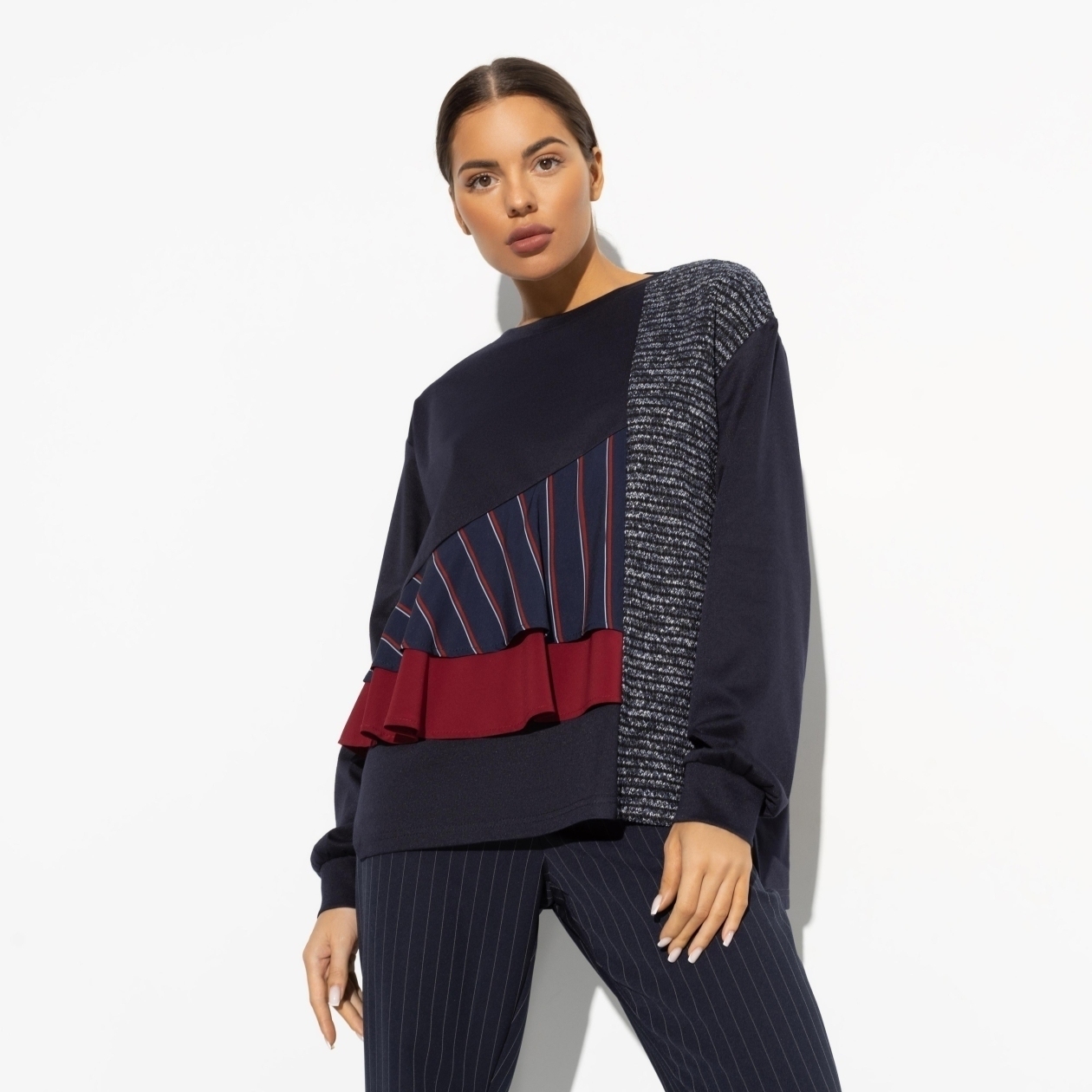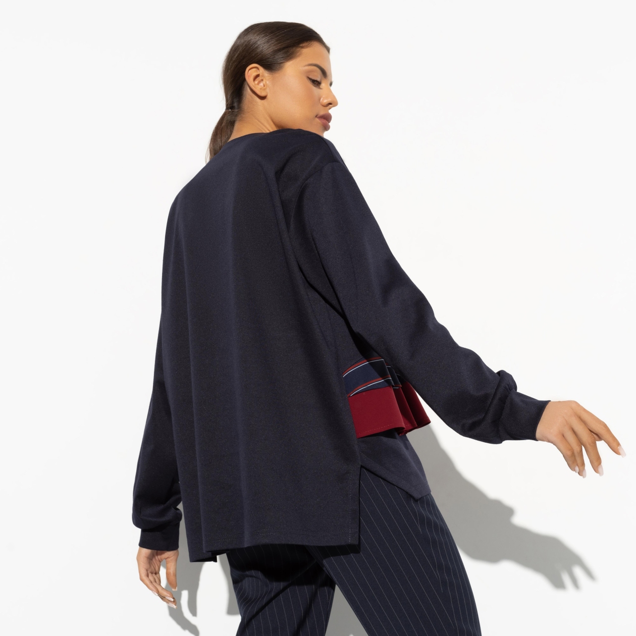 Молодые, свободные и дерзкие - мы едем по трассе, наматывая бесконечные километры глубоких разговоров. Ты открываешь окно, запуская хваткую лапу ветра внутрь. Но тебе не страшно. Свитшот в цвете глубокой ночи с деталям винного цвета защищает тебя от любых невзгод. Свитшот свободного кроя. Длина до середины бедра. Легкая асимметрия между передней и задней частью изделия. Свитшот сшит из разных видов ткани. Есть объемные рюши спереди.