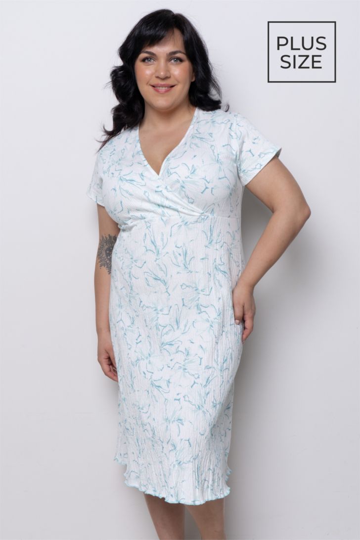 Платье с коротким рукавом. Вырез горловины V - образный, с запахом. По низу изделия проложена волнистая строчка, делающая модель романтичной. Платье представлено в 2 - х цветовых решениях.
