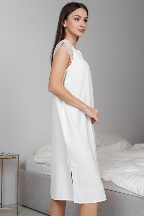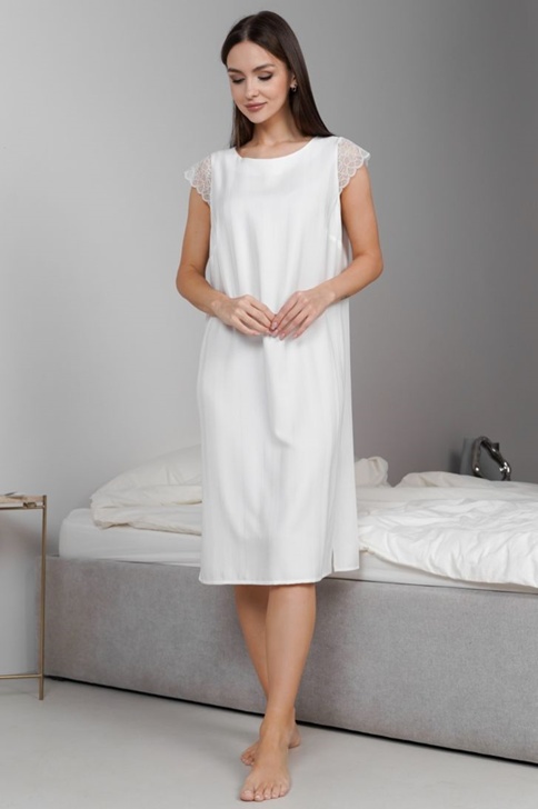 "Сорочка свободного прилегания с круглым вырезом горловины. Короткий рукав декорирован нежным кружевом. Разрезы по низу в боковых швах делают движения легкими и свободными.
