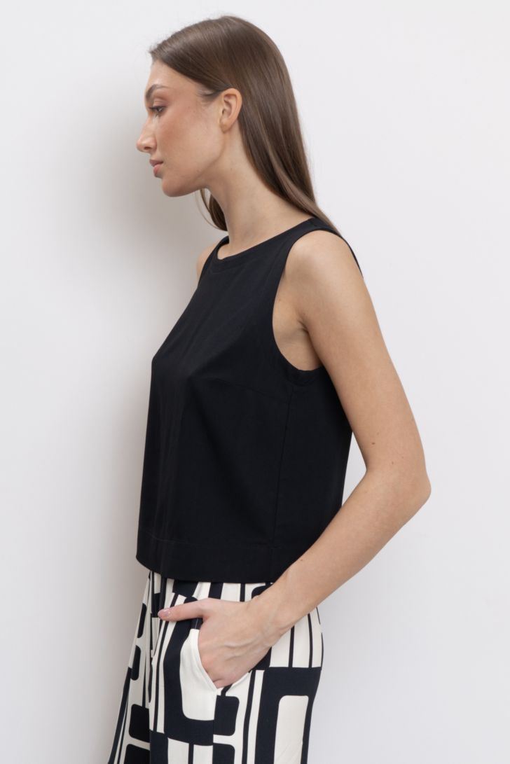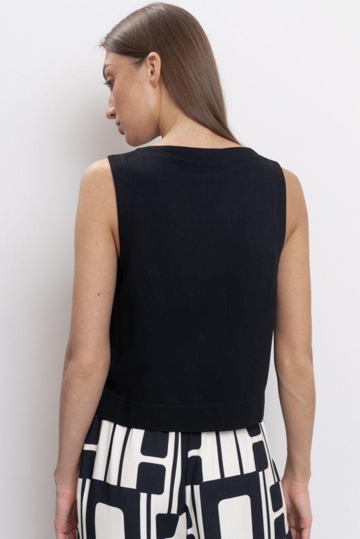 Идеальный выбор для создания легкого и модного образа -укороченный топ с круглым вырезом горловины и открытой проймой. Для более эффектной посадки на фигуре в модели предусмотрены вытачки. Топ завершит образ к струящимся широким брюкам данной коллекции или к брюкам из личного гардероба. Модель представлена в двух цветовых решениях.