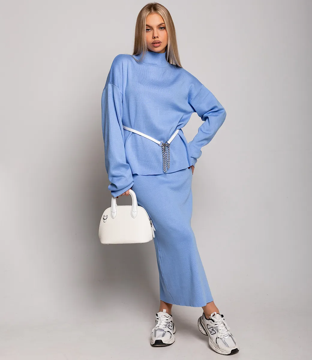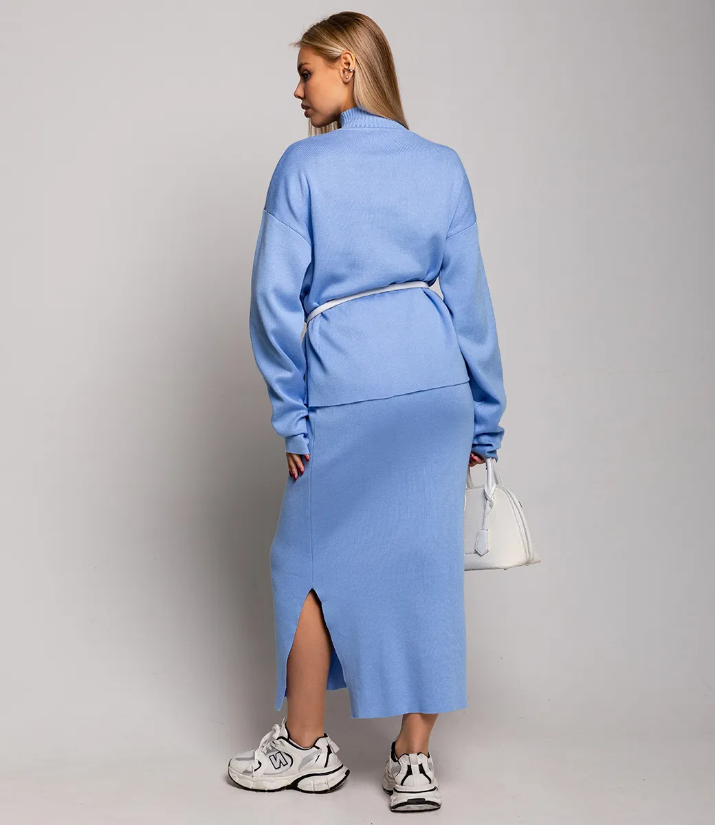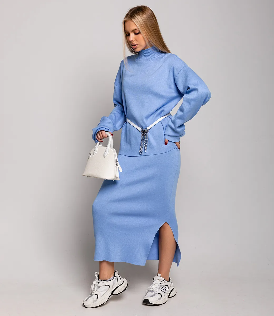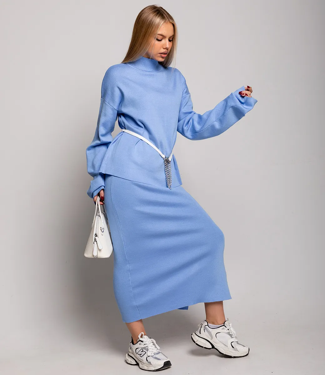 Трикотажный костюм, который состоит из свитера и удлиненной юбки. Модель отлично подходит для прохладной погоды, даря тепло и комфорт.