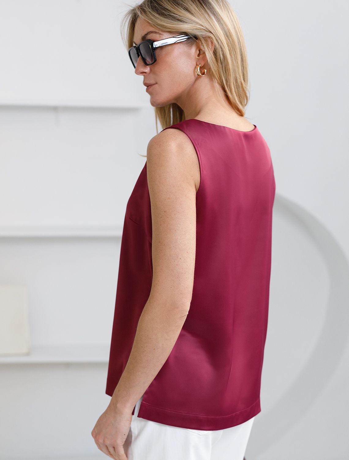 Этот топ идеально подойдет для создания стильного ансамбля на вечерние мероприятия или важные события. Благодаря сочетанию элегантности и практичности, такая стильная блузка без рукавов станет незаменимой частью гардероба для женщин, которые ценят качество и комфорт в одежде. Благородный блеск сатина добавляет нотку роскоши в повседневный гардероб и гармонично сочетается с разными стилями одежды: офисными брюками, джинсами или юбками. V-образный вырез визуально вытягивает шею и создает элегантный акцент в зоне декольте, делая образ более открытым и современным.