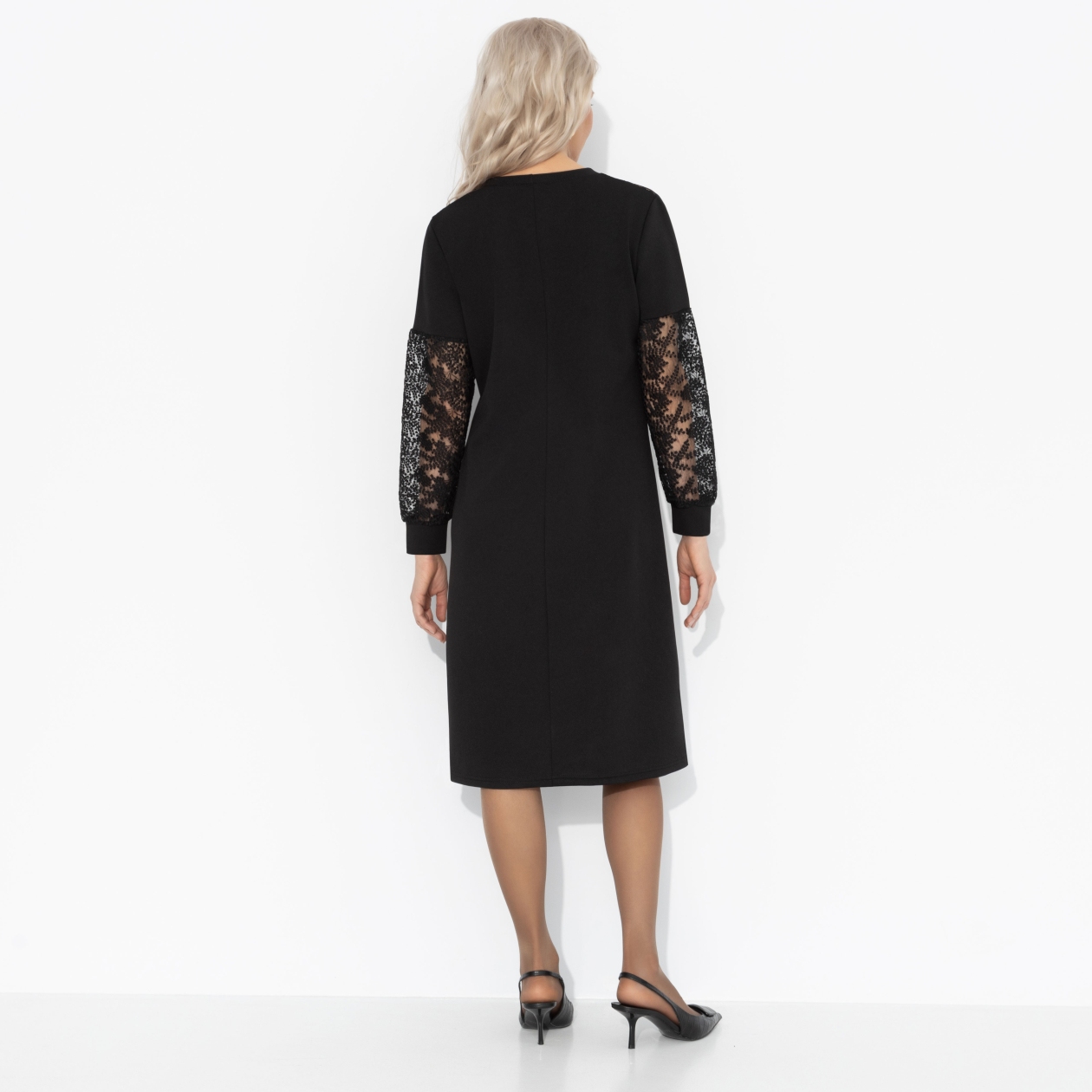 Она отключила телефон. Оставила суету за дверью. Платье из ткани «Диор» с кружевными рукавами мягко ложится по силуэту – и кажется, будто делает ее еще красивее. В отражении зеркала – спокойствие, вкус к жизни и лёгкая интрига. Платье прямого силуэта длины миди с мягкой посадкой по фигуре. Полупрозрачная вставка из сетки и рукава из гипюра-стрейч создают изящный контраст фактур.