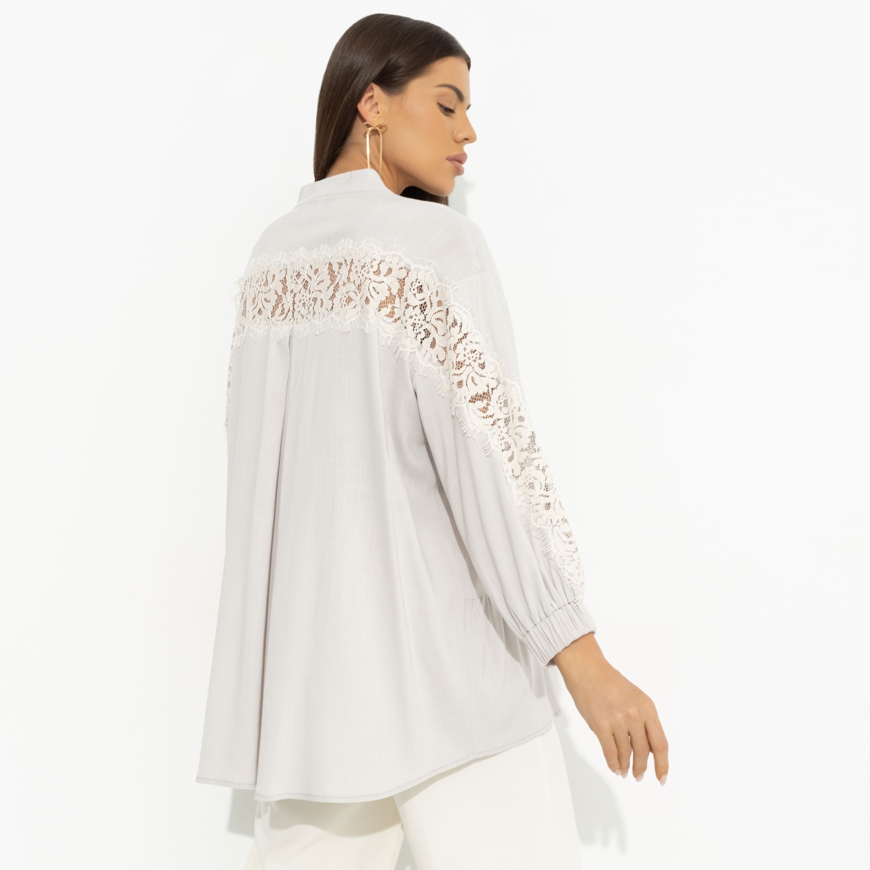 В начале дня важно расставить акценты правильно – зарядка вместо зависания в телефоне, травяной чай вместо кофе и рубашка CHARUTTI вместо всего остального. В ней есть всё – нужный крой, привлекающие внимание детали и нежный цвет. Рубашка свободного силуэта. Рукава и спинка оформлены тонким кружевом. Манжеты оформлены широкой резинкой. Имитация карманов по передней части изделия. Рубашка застегивается на пуговицы.
