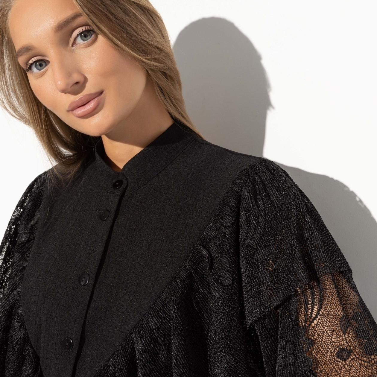 Главный акцент рубашки — это кружево, которое подчёркивается насыщенным чёрным цветом, придающим изделию глубину и элегантность. Разрез на спинке с завязками добавляет уникальности, превращая рубашку в идеальный выбор как для дневных мероприятий, так и для вечерних выходов. Этот стильный элемент делает рубашку привлекательным вариантом для оптовых закупок, так как она легко комбинируется с различными нарядами и подходит для множества случаев.