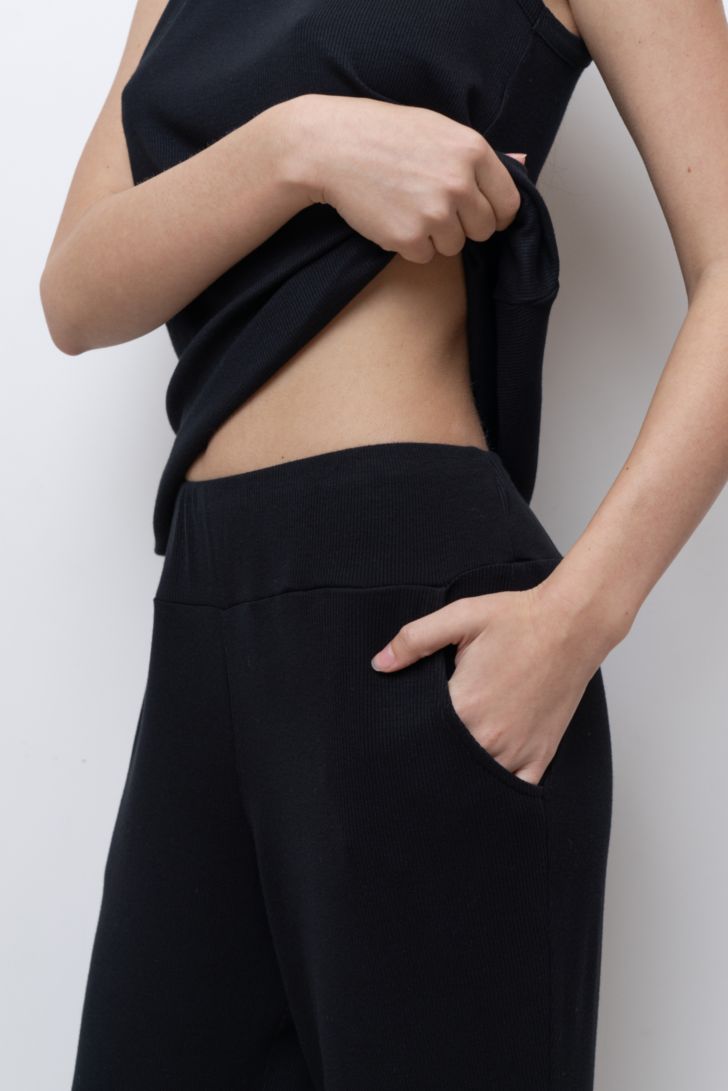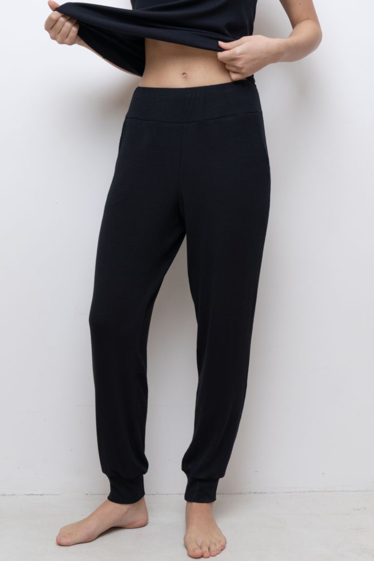 Брюки на манжете по низу свободного силуэта. Пояс на мягкой вшивной резинке.. В боковых швах функциональные карманы. Модель представлена в трех цветовых решениях.