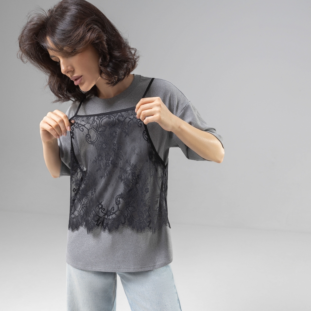 Высокий стиль требует изобретательности. Умение удивлять и вызывать уважение делает вас неподражаемой. Подтвердите свое модное превосходство футболкой CHARUTTI. Футболка свободного кроя. Материал футболки в деликатный рубчик. Топ из кружева – съемный. Топ на тонких бретелях. Все швы изделия обработаны.