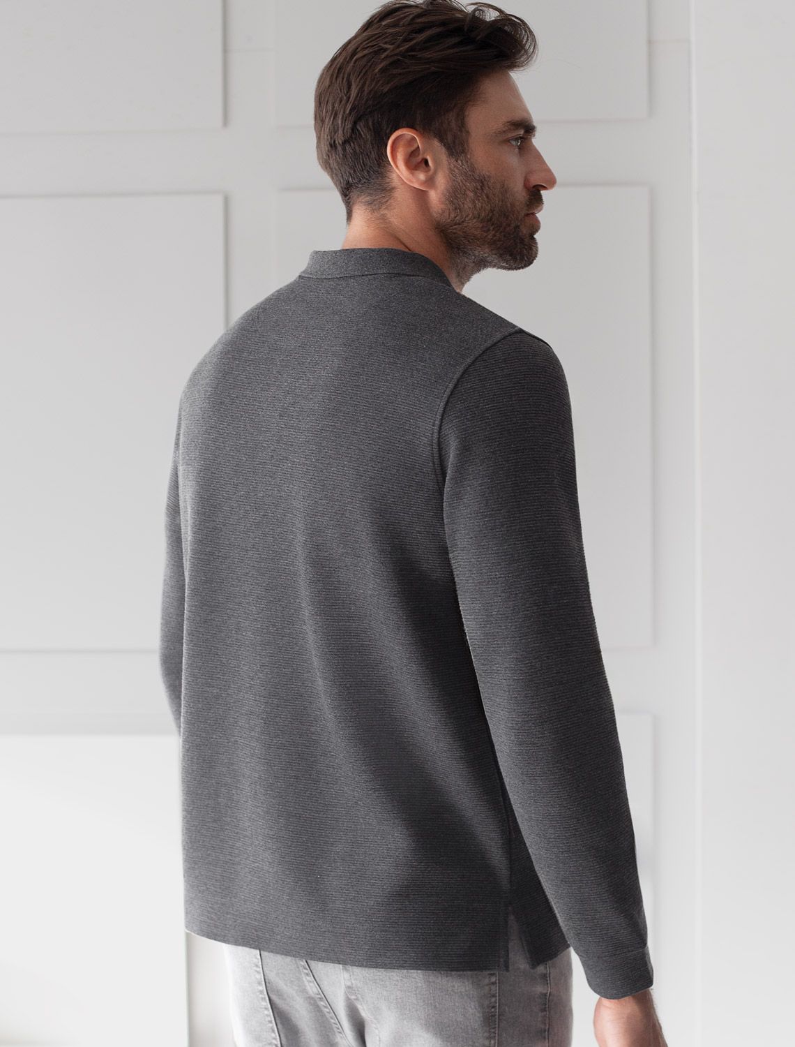 Ст.цена 1790р Лонгслив из мягкого фактурного трикотажа с плетеным воротником поло на пуговицах U49.062 т.серый меланж