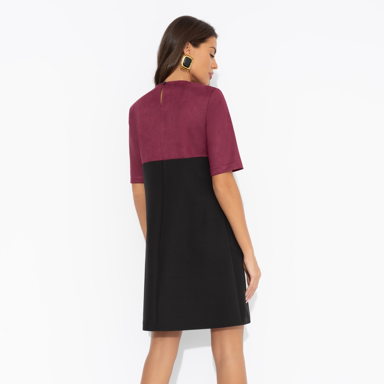«Идеал красоты» в длине мини – это вызов, облечённый в замшу. Оно будто говорит: «Смотри, но не трогай». Платье трапециевидного силуэта в длине до колена. Комбинация двух видов ткани. Хорошо смотрится на любом типе фигуры. Изделие с карманами. Деликатная пуговица сзади.