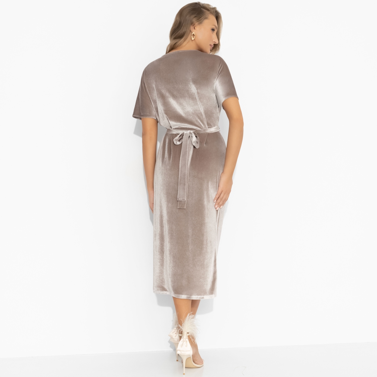 Бой курантов всё ближе. В бокалах играет свет гирлянд, а она улыбается – в отражении свечей сияет бархат. Ткань оттенка шампанского эффектно драпируется, подчеркивая изгибы и настроение. Акцент на талии, лёгкий блеск – и праздник начинается с неё. Платье на запах с эффектной драпировкой.
