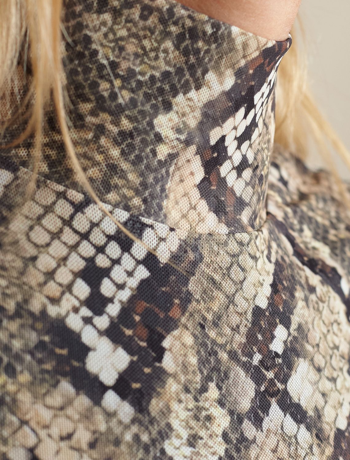 Трендовая модель - водолазка с эффектом змеиной кожи! Вискозное тело с рельефным змеиным принтом сочетается с воздушными сетчатыми рукавами, создавая эффектный контраст. Двойной воротник с отворотом повторяет экзотический узор, позволяя варьировать образ от сдержанного до дерзкого. Практичная вискоза с модным принтом – идеальное решение для тех, кто ценит стиль и комфорт. Змеиный узор делает эту модель особенно актуальной, превращая базовый предмет гардероба в модный акцент!
