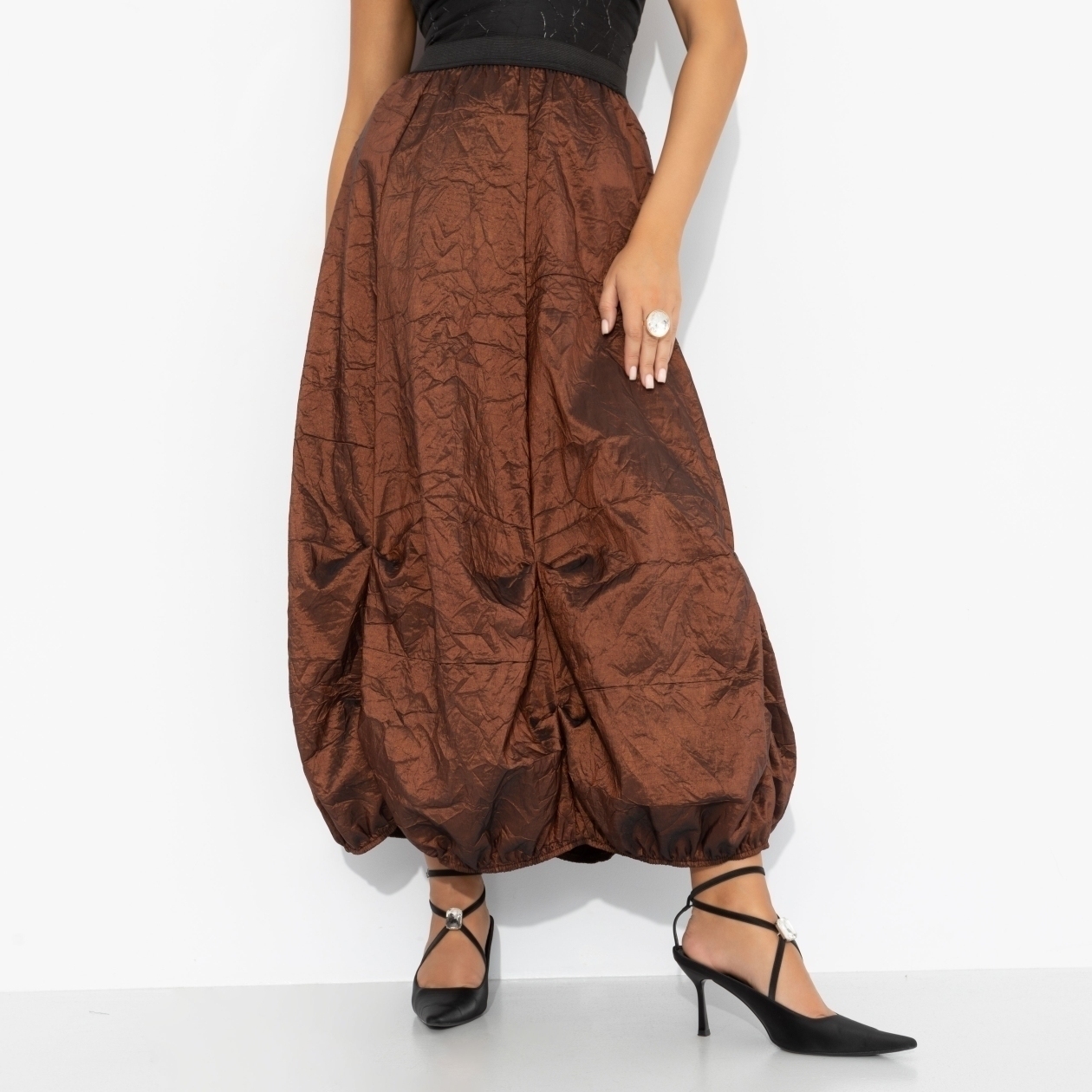 Юбка-баллон в оттенке эффектной бронзы, как на показах Celine. Хочешь удивить всех на корпоративной ёлке? Надевай с корсетом для wow-выхода по примеру Зендеи или с укороченным блейзером – в духе модных хроник Met Gala. Объемная юбка из жатой ткани с отливом и защипами. Пояс на резинке. Держит форму, не мнётся. Идеальна для трендовых сетов и акцентных образов любой вечеринки.