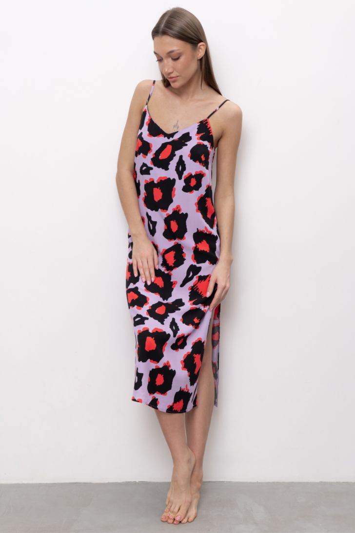 Длинное платье из струящейся вискозы на тонких регулируемых бретелях и разрезами в боковых швах. Лиф модели V-образный. Модель представлена в 3-х цветах.