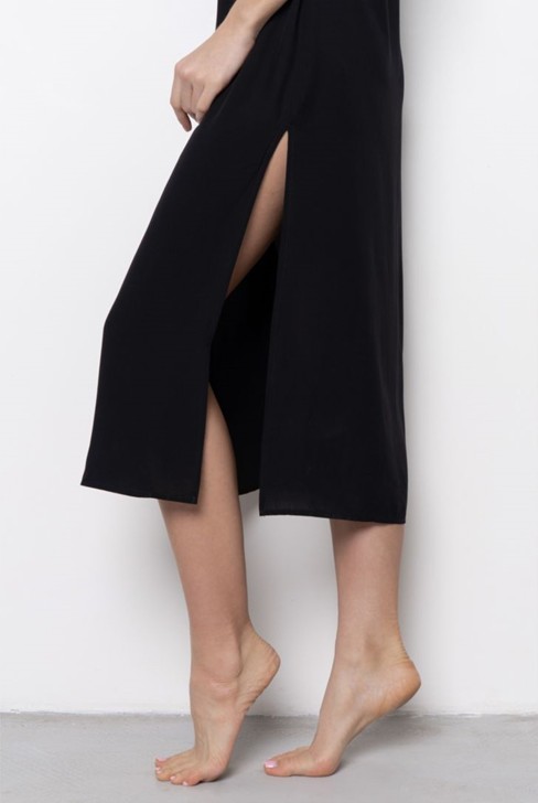 Длинное платье из струящейся вискозы на тонких регулируемых бретелях и разрезами в боковых швах. Лиф модели V-образный. Модель представлена в 3-х цветах.