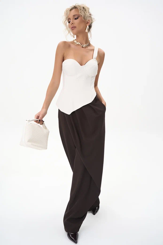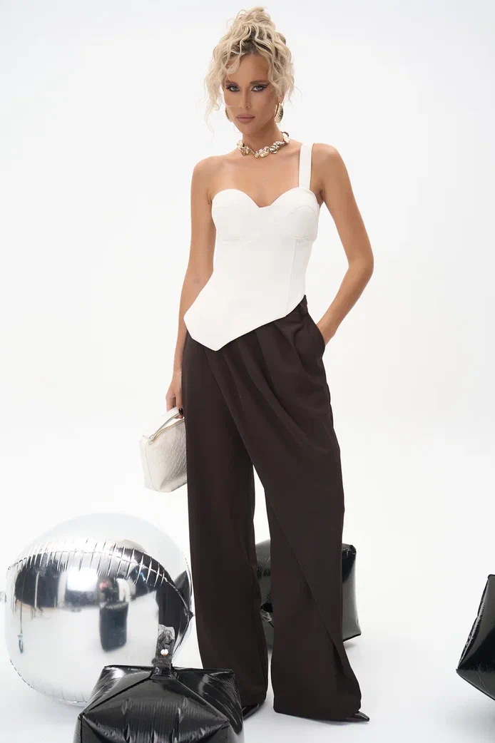 Оригинальные брюки с высокой посадкой расклешенного силуэта. Особенность этой модели – изысканный асимметричный запах спереди. Брюки из прочной ткани с добавлением вискозы застегиваются в левом боковом шве на потайную тесьму-молнию.
