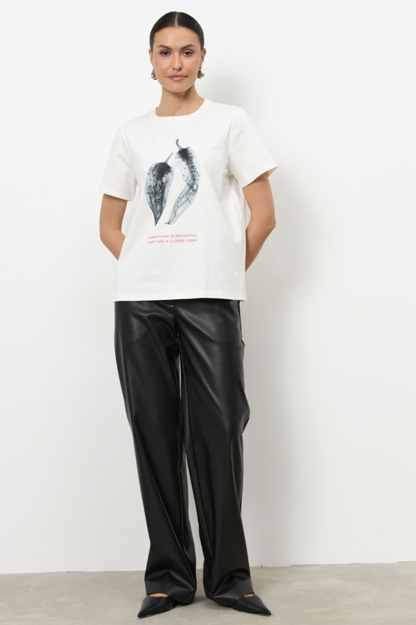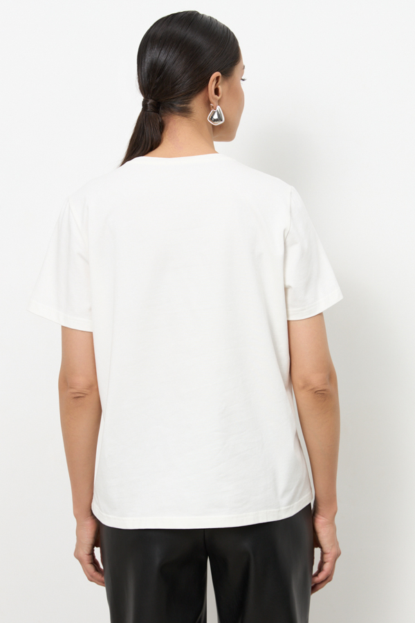 Джемпер свободного силуэта из хлопкового эластичного полотна. Втачной короткий рукав. Круглый вырез горловины оформлен бейкой.