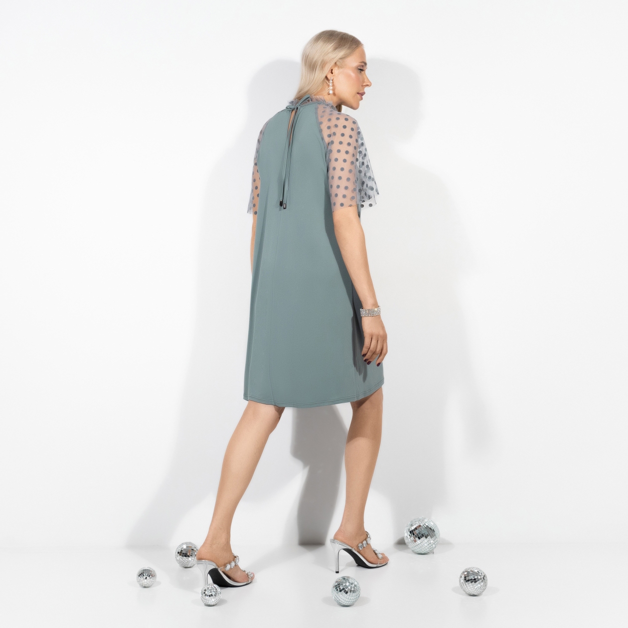 Прозрачность держится в топе трендов. Это модное веяние выделяет вас среди окружающих. Но также обращает на себя внимание нетривиальный цвет платья CHARUTTI. Разбавленный оливковый в сочетании с кружевом сделает вас королевой вечеринки. Платье прямого силуэта в длине до колена. Акцентные прозрачные рукава. Декоративная сборка в зоне груди. Есть завязки по задней части изделия.