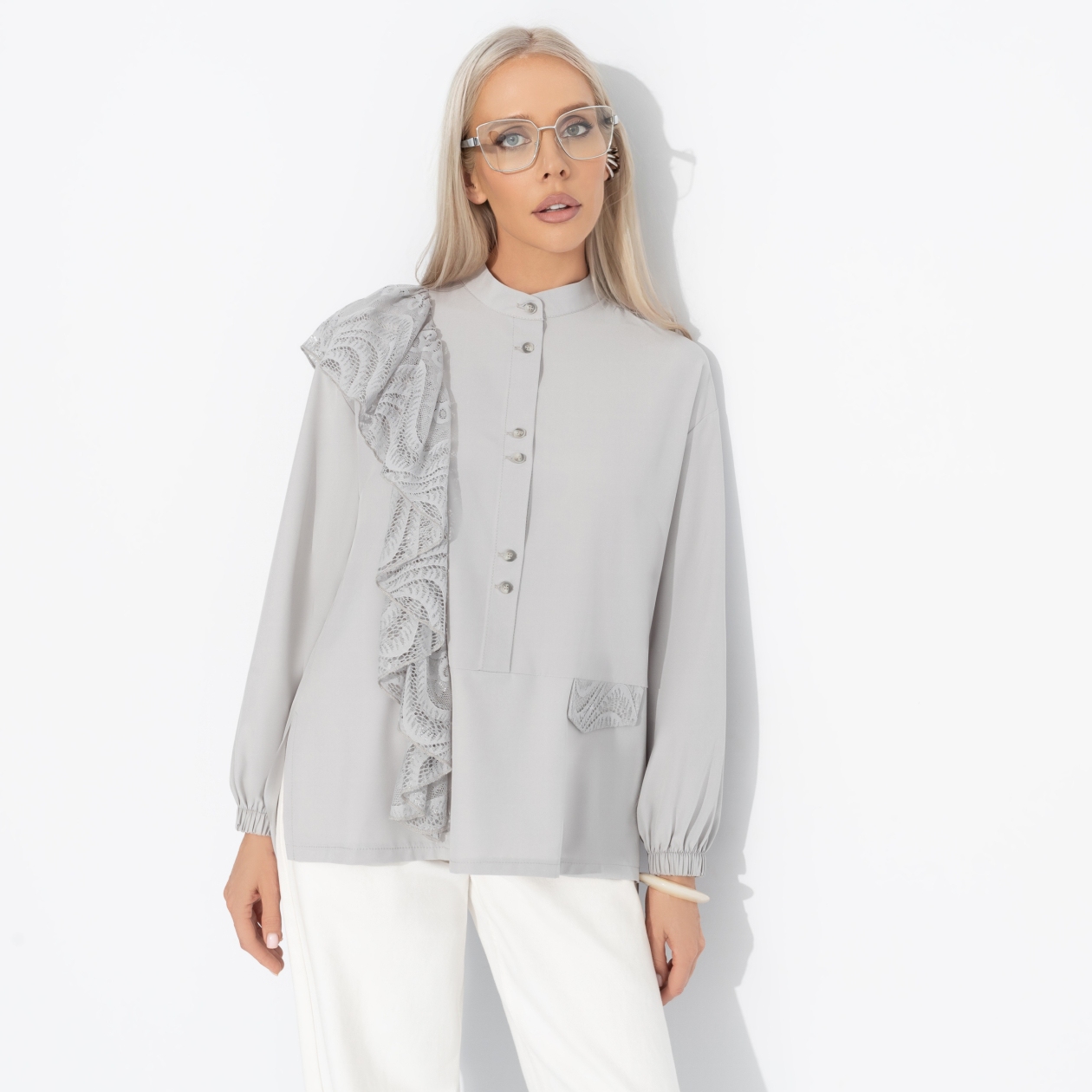 Блуза от CHARUTTI всем своим видом желает вам продуктивной недели. Пусть дни будут свободными, как крой этой блузы и наполнены нежностью кружева. Пусть выходные будут удлиненными, как фасон изделия и в каждом дне будет место маленькой, как пуговица блузы, радости. Блуза свободного кроя. Воротник-стойка. Манжеты рукавов оформлены скрытой резинкой. Акцентное тонкое кружево с двух сторон изделия – по передней стороне и по спинке. Имитация кармана с одной стороны блузы.