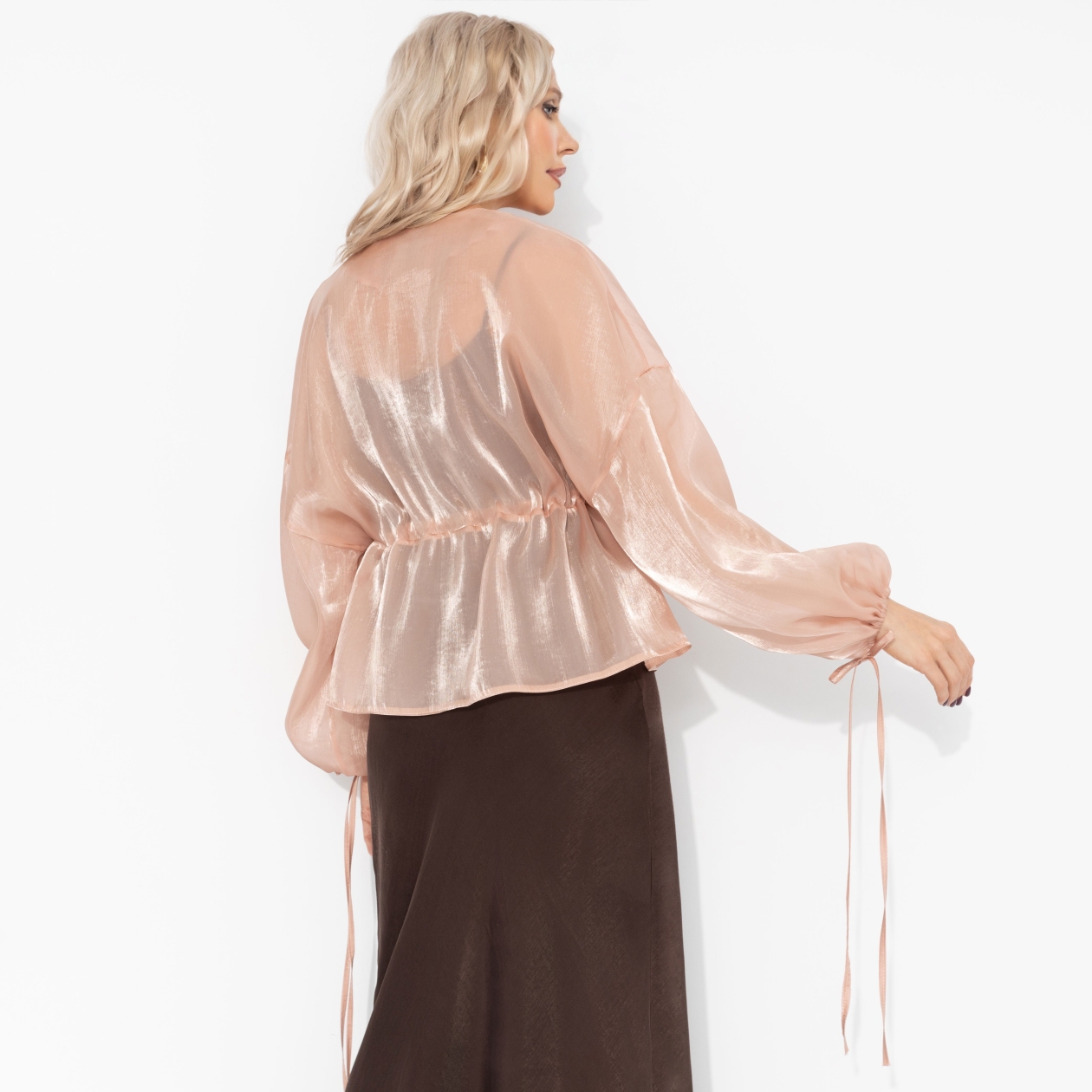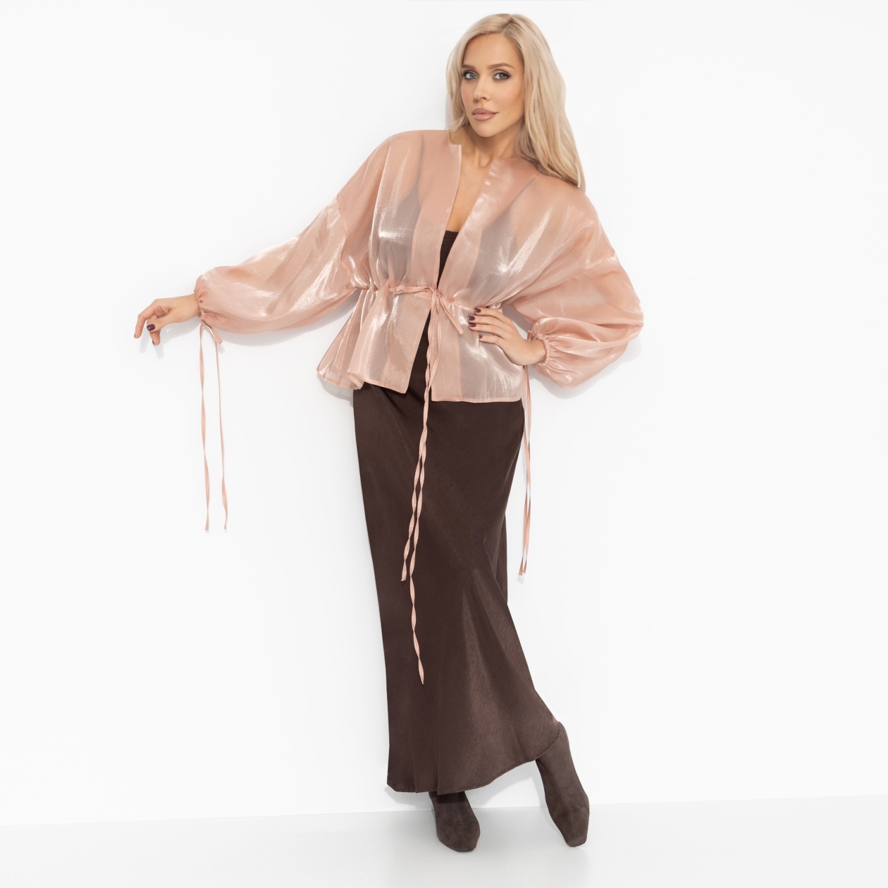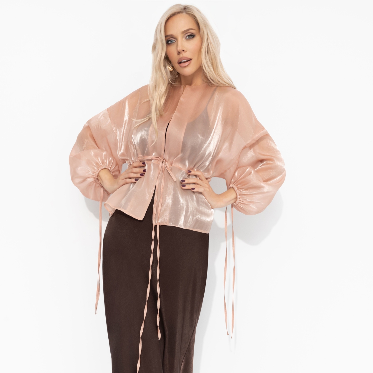 Такой важный день она решила встретить в утонченной нежности, выбрав жакет ЧАРУТТИ из струящейся органзы пудрового оттенка. Невесомый крой и мягкий цвет создавали образ одновременно торжественный и безмятежный, как утро ее главного дня. Объемные рукава, похожие на лепестки пиона, обволакивали каждое её движение. В этом наряде она чувствовала ту гармонию и внутреннее спокойствие, которые должны были стать залогом её успеха. Жакет объемного кроя. Есть регулируемая кулиска на талии. Линия плеча спущена. Есть шнуровка по манжетам. Материал изделия слегка просвечивает, с блеском.