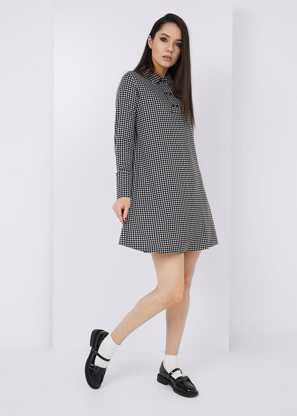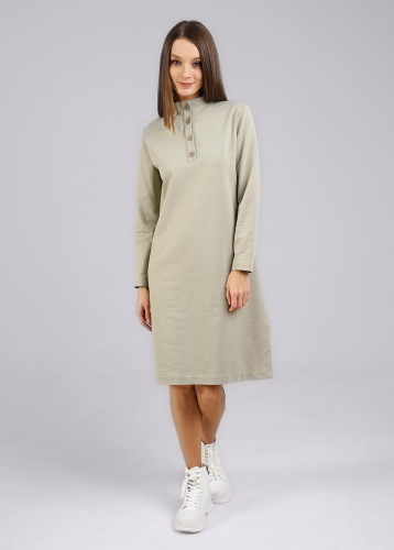 Платье из вискозного трикотажного полотна,немного расклешенное книзу.Длиной выше колена.По горловине отложной воротник.Спереди притачная планка, застежка на пуговицы в два ряда. Втачной длинный рукав,по низу рукава высокий манжет с застежкой на пуговицы.