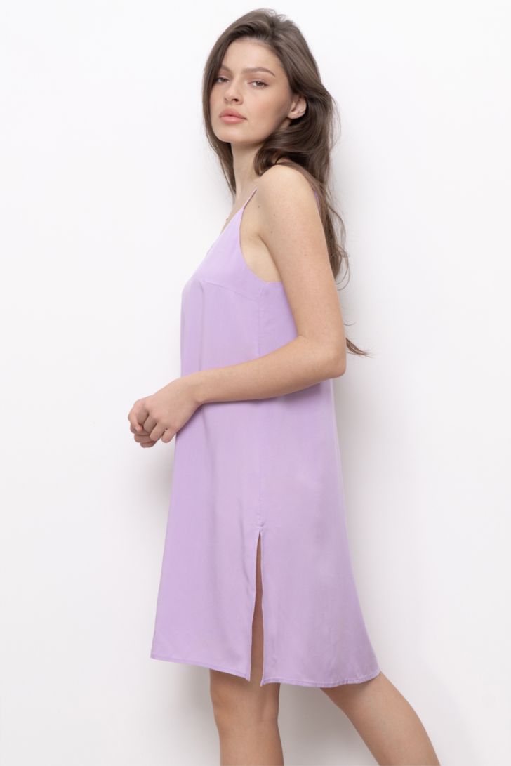 Сорочка из струящейся вискозы на тонких регулируемых бретелях и разрезами в боковых швах. Лиф модели V-образный.