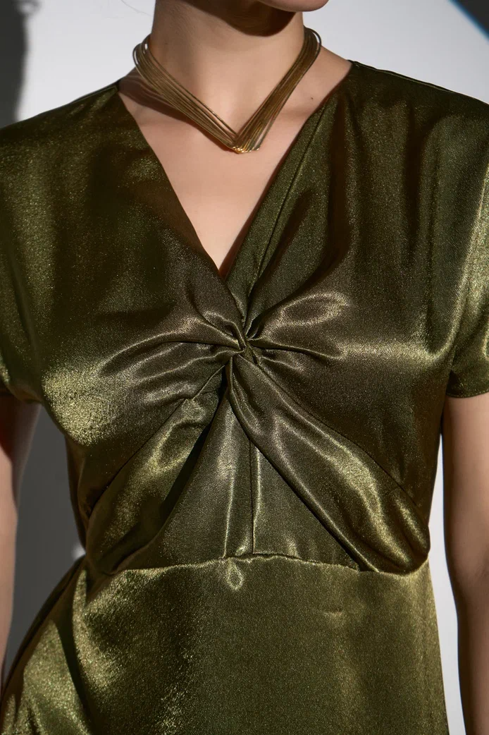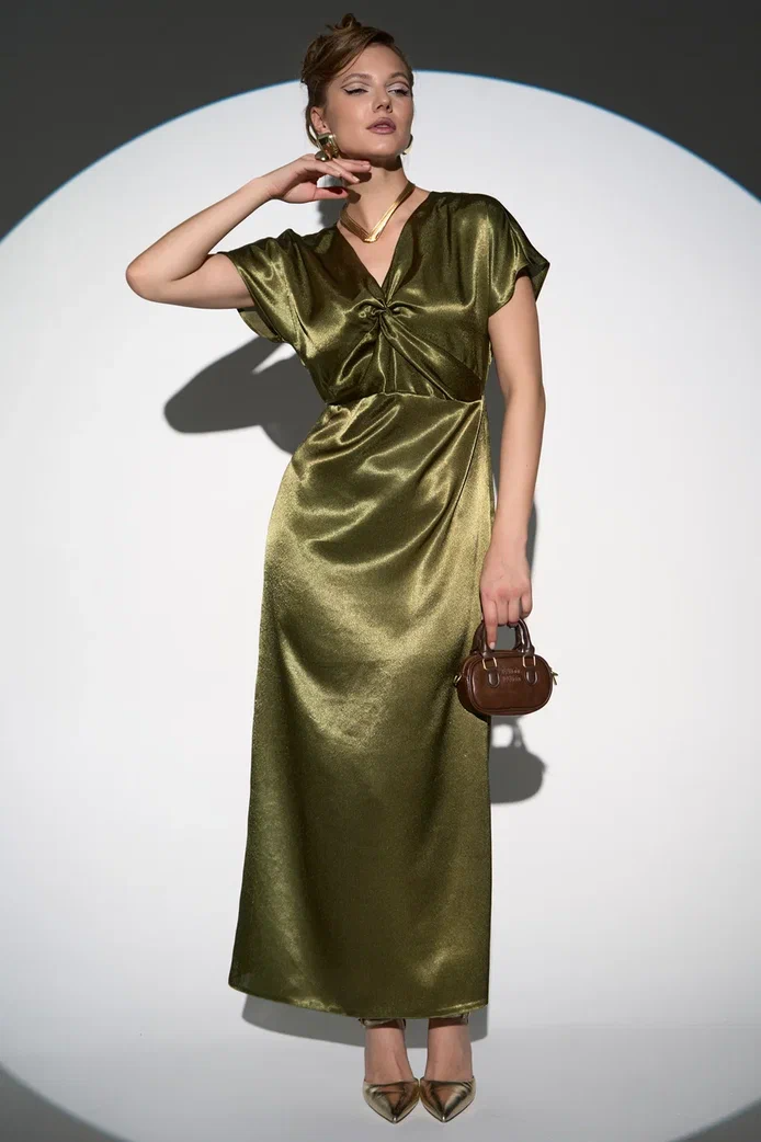 Шелковое платье длиной–макси в глубоком оливковом оттенке. Элегантный V-вырез с декоративной сборкой и узловым центром спереди подчёркивает бюст, а завышенная линия талии и мягко струящийся юбочный клин на косой посадке создают лёгкий, женственный силуэт. Короткие рукава, зеркальный сатиновый блеск и минималистичный крой делают модель идеальной для вечерних выходов и серьёзных поводов. Носится как с тонким ремнём для акцента на талии, так и без — выглядит утончённо и современно.
