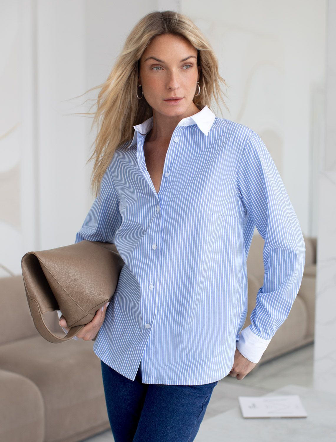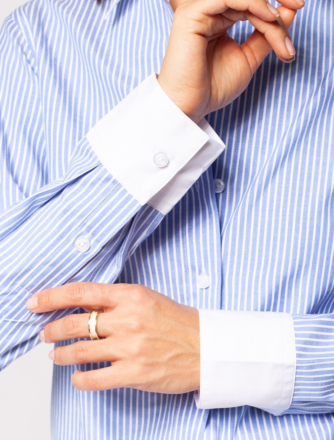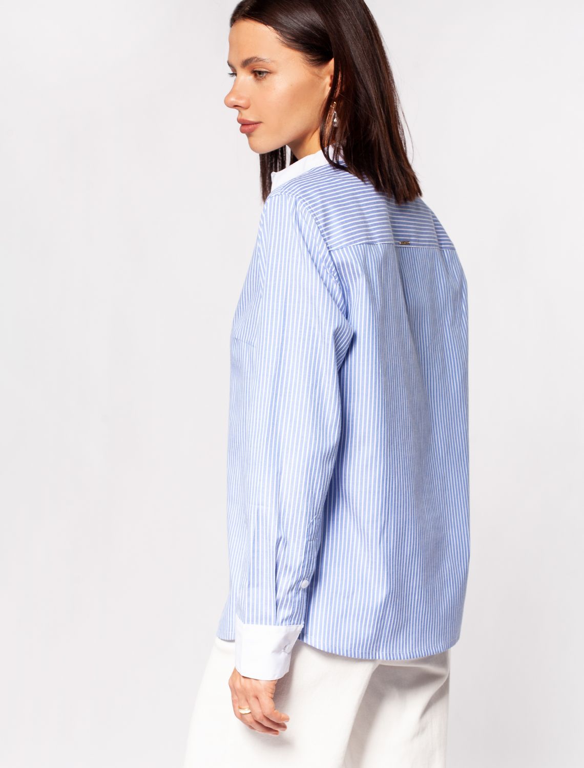 Блузка прямого силуэта с контрастными манжетами и отложным воротником. Модель выполнена из хлопка с добавлением ПЭ, благодаря этому материал почти не мнется, долго сохраняет идеальный внешний вид. На спинке изделия металлический логотип бренда.