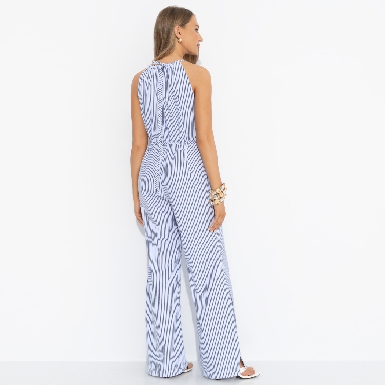 Отправиться в круиз? Почему бы и да?! Активный и роскошный отдых на огромном теплоходе или на лаконичной яхте. Ты готова к разным вариантам, главное, что комбинезон CHARUTTI в тонкую морскую полоску с тобой. Комбинезон с брюками. Акцент на талии – есть шлевки с тонким поясом. Сборочка на шее. Завязки по спинке изделия.