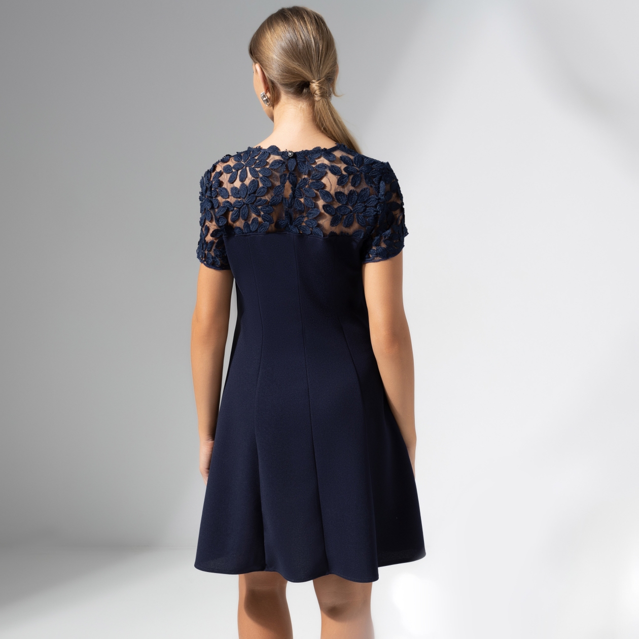 Кто знает, что будет завтра? Поэтому важно выбирать самое лучшее уже сейчас. Если вы по какой-то причине избегали коротких женственных платьев, измените мнение. Вариант от CHARUTTI в цвете темной летней ночи создан для нового осознания себя. Платье приталенного силуэта в длине мини. Плечевая часть изделия оформлена фактурным кружевом. Застежка на миниатюрную пуговицу по спинке.