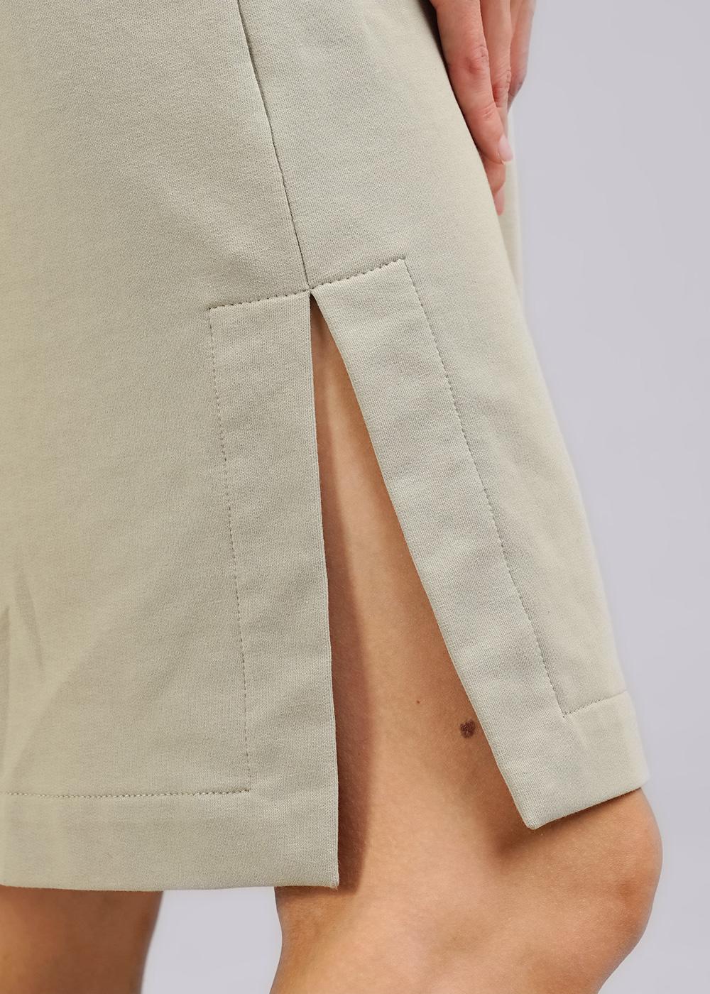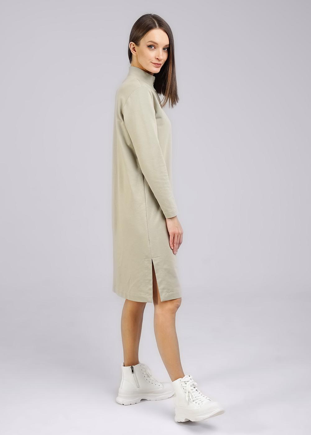 Платье из эластичного хлопкового футера 2х нитки. Длинный втачной рукав. Воротник стойка и планка с застежкой на пуговицы выполнены из кашкорсе. По низу изделия разрезы.