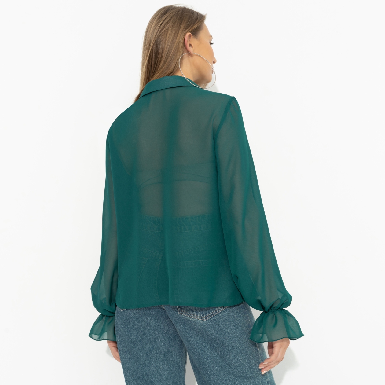 Когда благородство изумруда встречает нежность воланов – появляется эта блуза! Для тех, кто любит быть в центре внимания, но без лишних слов. Добавляем в корзину. Блуза свободного силуэта. Передняя часть изделия дополнена рюшами. Рукава на тонкой резинке. Ткань слегка просвечивает. Блуза застегивается на пуговицы по передней части. Изделие хорошо смотрится навыпуск и в заправленном виде.