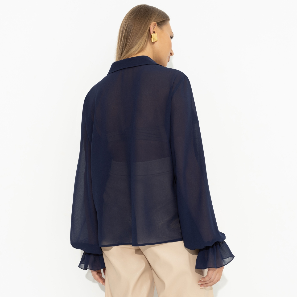 Блуза «Гипнотический стиль» из креп-шифона — это символ изысканности и утонченности, который станет жемчужиной вашего гардероба. Глубокий, насыщенный синий цвет напоминает о таинственной красоте ночного неба, придавая вам уверенность и стиль. Если вы ищете женскую блузу с воланами, которая подчеркнет вашу индивидуальность и станет идеальным элементом как повседневного, так и вечернего образа, эта модель — ваш выбор. Свободный силуэт и детализированные рюши создают воздушный и легкий образ, который привлечет внимание на любом мероприятии. Ваша коллекция женских нарядных блузок будет неполной без этой уникальной вещи.