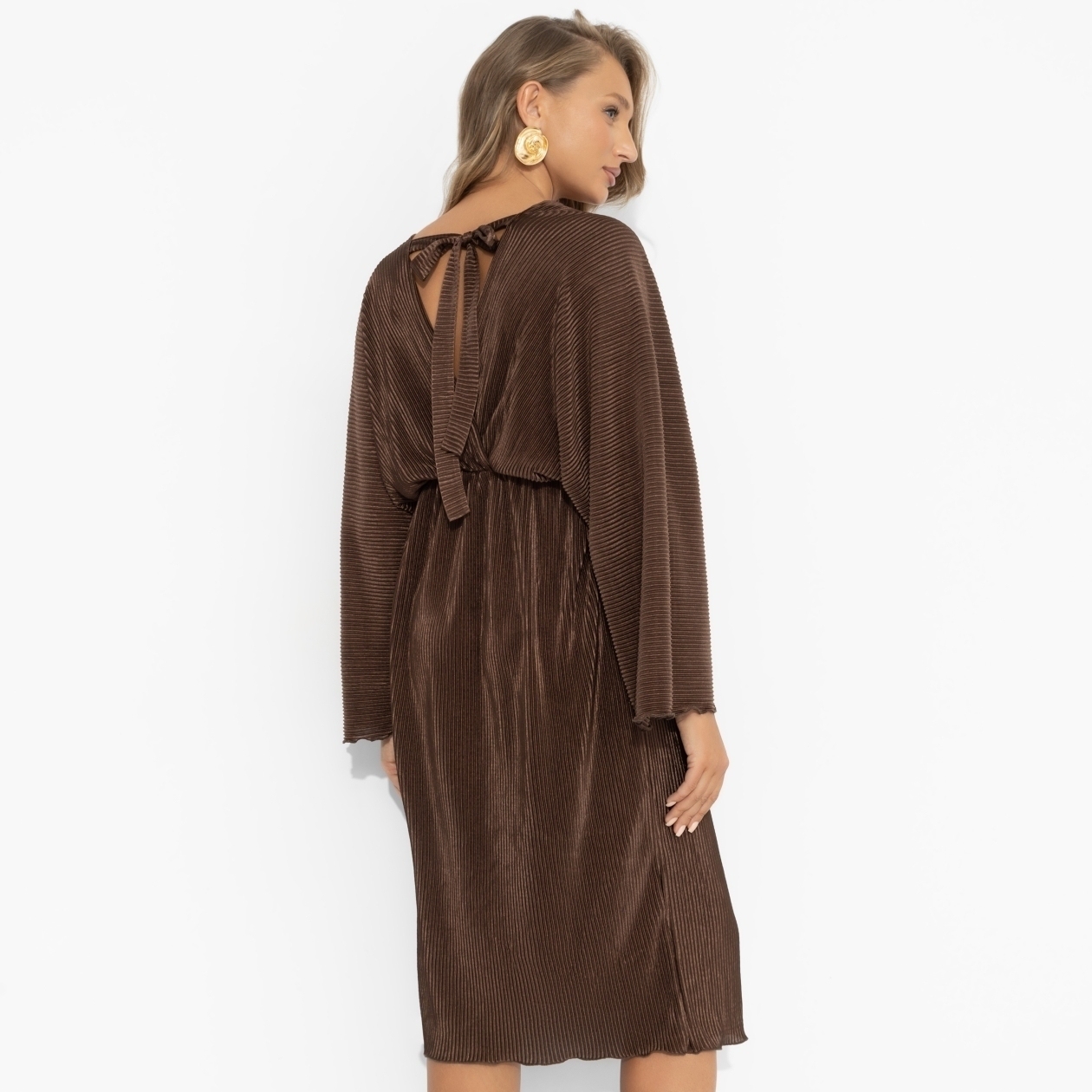 Тихий джаз, мягкий свет и лёгкий аромат ванили в воздухе. Платье в оттенке молочного шоколада будто сошло с вечеринок 20-х – расслабленный крой, струящаяся ткань и глубокое декольте создают томный, женственный силуэт. Просто надень и позволь себе быть роскошной без слов. Платье со свободными акцентными рукавами. Степень оголения ключиц можно регулировать.