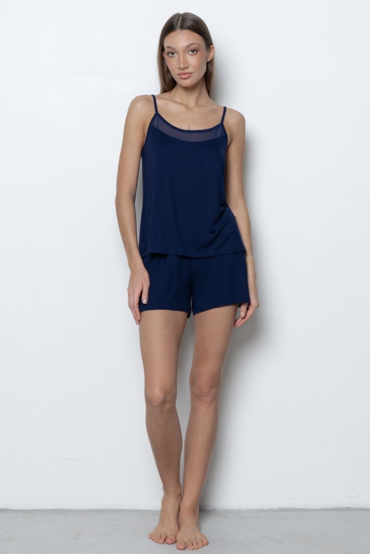Топ на тонких регулируемых бретелях с полукруглым вырезом горловины. Спереди вырез оформлен вставкой из сетки в цвет основного полотна, на спинке — глубокая треугольная вставка из сетки, которая создаёт лёгкий и изящный акцент.