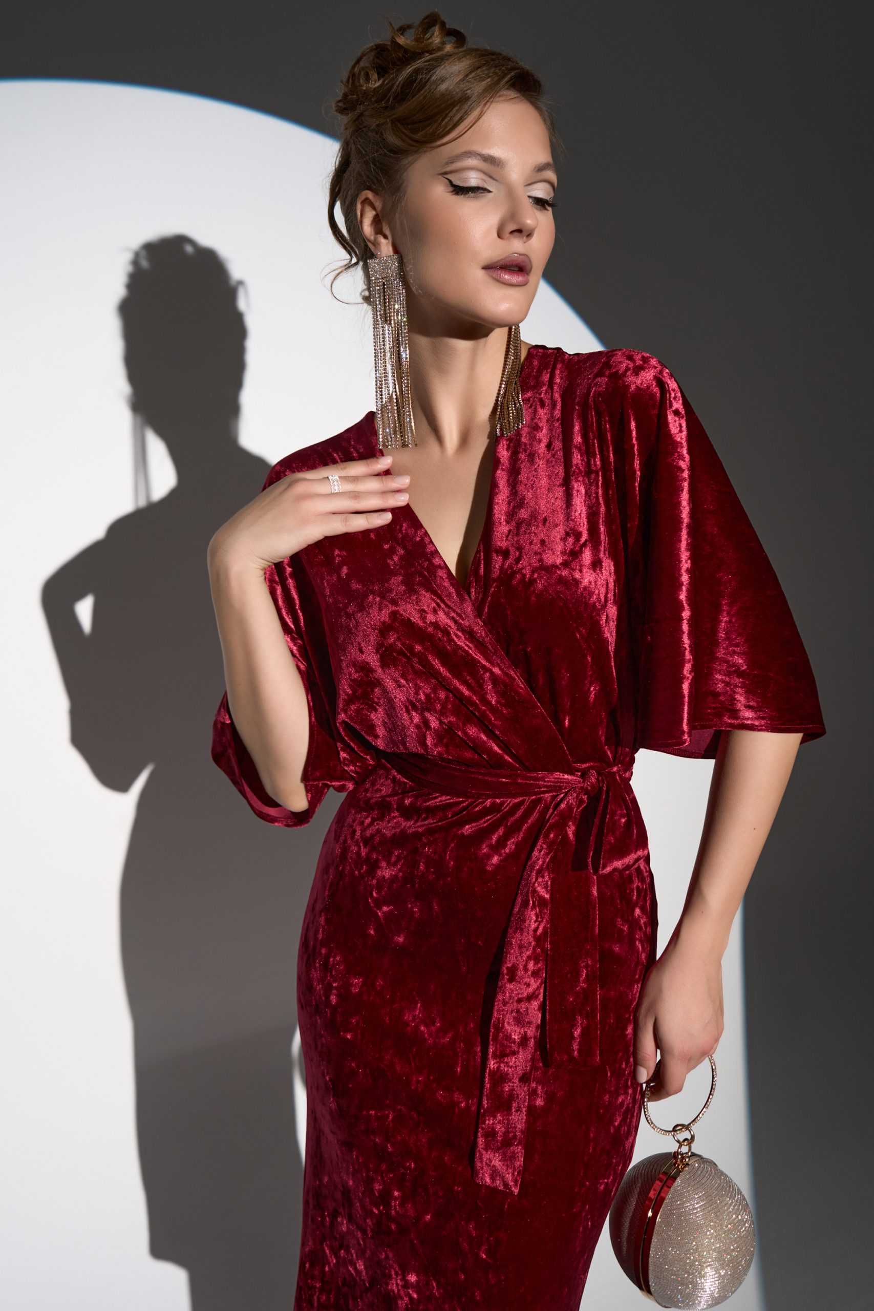 Эффектное платье “Нимфа” поможет Вам создать женственный образ. Изготовлено из приятного к телу высококачественного эластичного бархата, дышащей ткани, которая не теряет форму и цвет даже после многочисленных стирок. Роскошный бархат придает платью невероятную текстурность, создавая эффект воздушности и изящества для незабываемого образа в ресторан, на торжество . Модель прямого кроя с длиной миди и пояс на талии обеспечат идеальную посадку, а рукав 3/4 в форме летучей мыши добавит образу романтичности. Платьеобладает несомненным преимуществом – оно не требует глажки, не мнется и легко стирается.