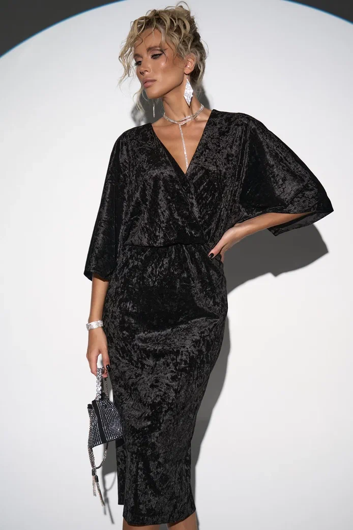 Эффектное платье “Нимфа” поможет Вам создать женственный образ. Изготовлено из приятного к телу высококачественного эластичного бархата, дышащей ткани, которая не теряет форму и цвет даже после многочисленных стирок. Роскошный бархат придает платью невероятную текстурность, создавая эффект воздушности и изящества для незабываемого образа в ресторан, на торжество . Модель прямого кроя с длиной миди и пояс на талии обеспечат идеальную посадку, а рукав 3/4 в форме летучей мыши добавит образу романтичности. Платьеобладает несомненным преимуществом – оно не требует глажки, не мнется и легко стирается.
