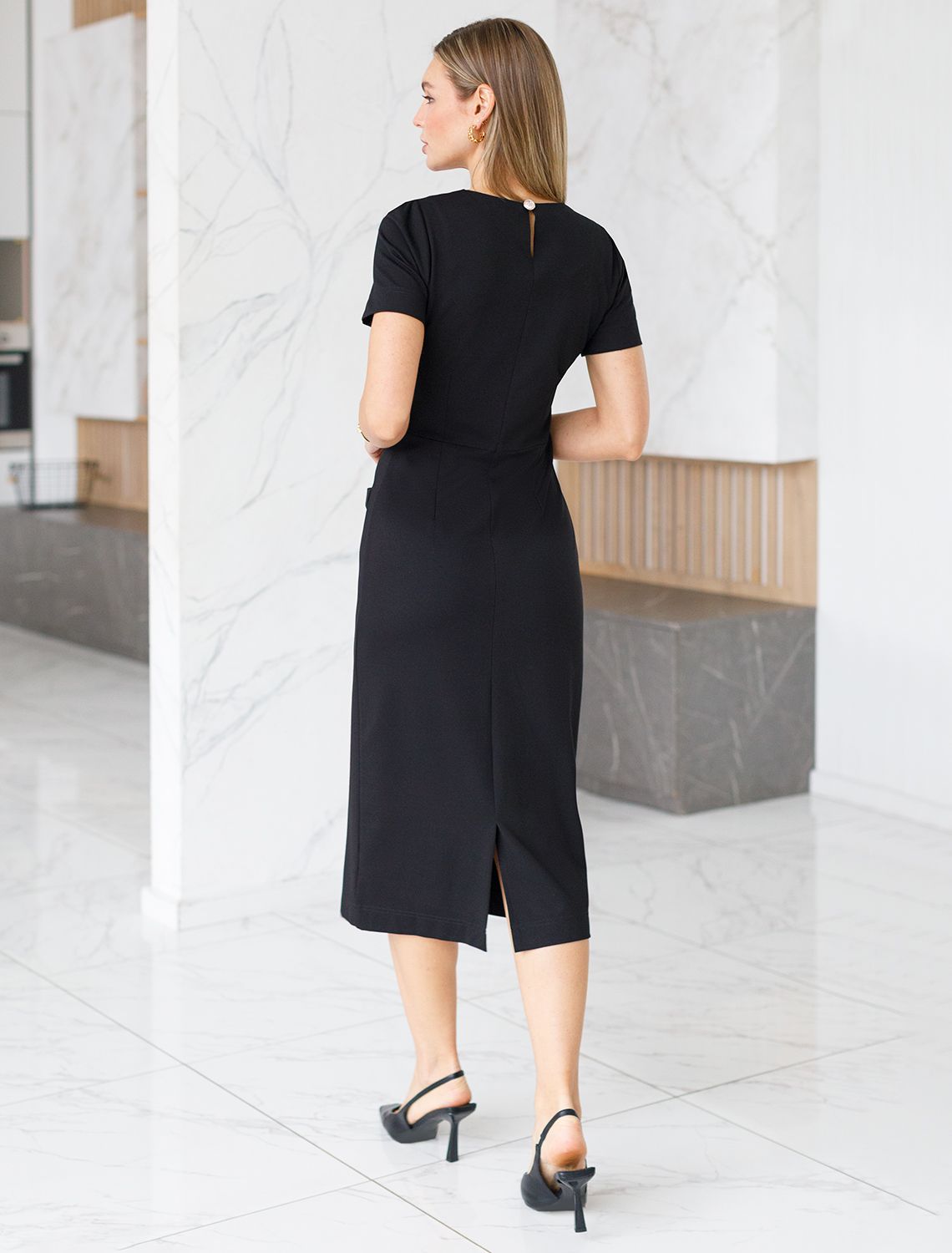 Платье выполнено из гладкого джерси. Благодаря эластичности трикотажа и застежке на боковую потайную молнию, модель идеально сидит по фигуре не сковывая движений. Сзади застежка на пуговицу. Черное платье из джерси – это универсальная база и классика, которую можно носить в любое время года.