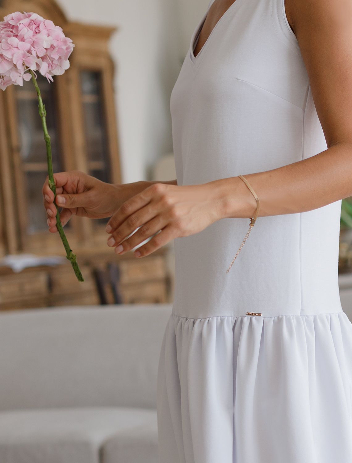 Платье с трендовым открытым срезом выполнено из облегченного тонкого футера. Прямой крой и V-вырез подчеркивает силуэт, пышная юбка волан с мягкими драпировками придает изделию романтичный характер. Эластичный материал из премиального хлопка обеспечивает абсолютный комфорт. Изделие дополнено металлическим логтипом бренда.