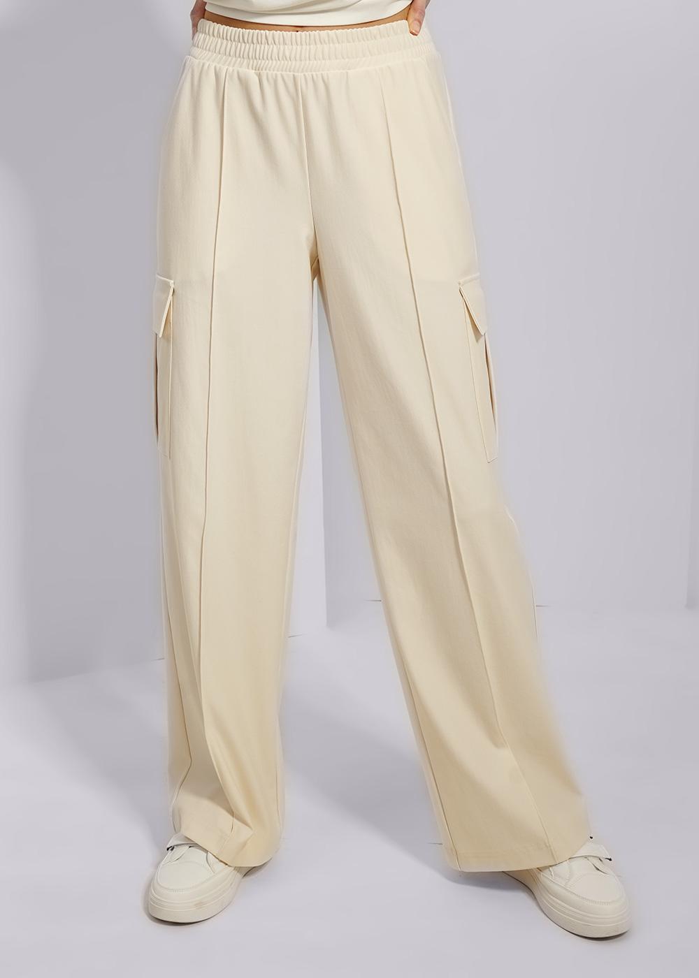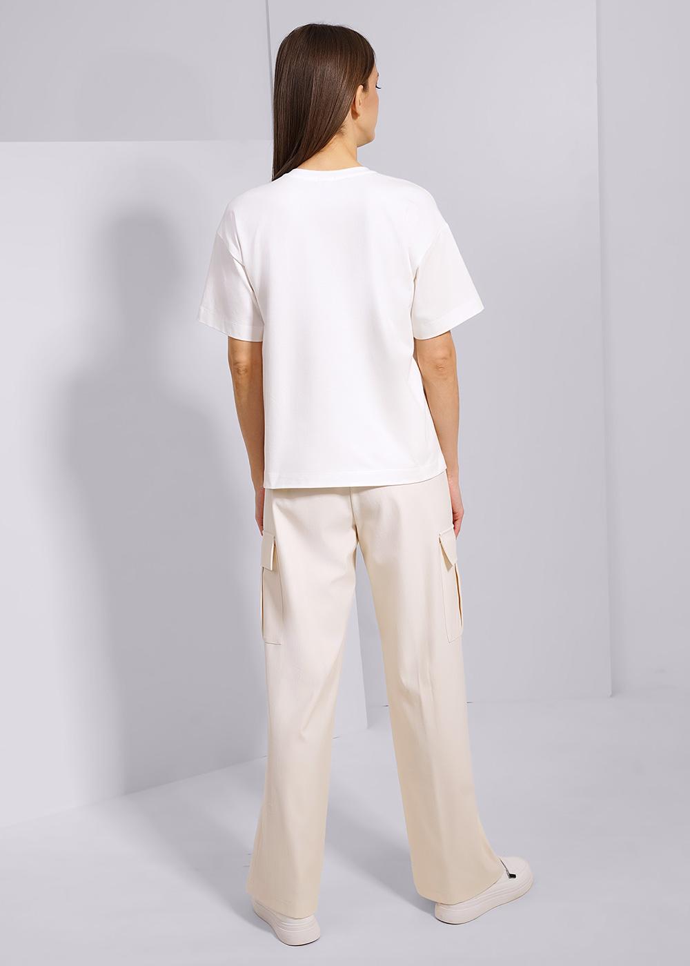 Брюки-карго широкие, прямого кроя из тонкого эластичного футера 2х нитки. Отрезной пояс на внутренней резинке с отстрочкой. Карманы с отрезным бочком и накладные карманы с клапаном. По переду отстроченный вертикальный узкий защип.