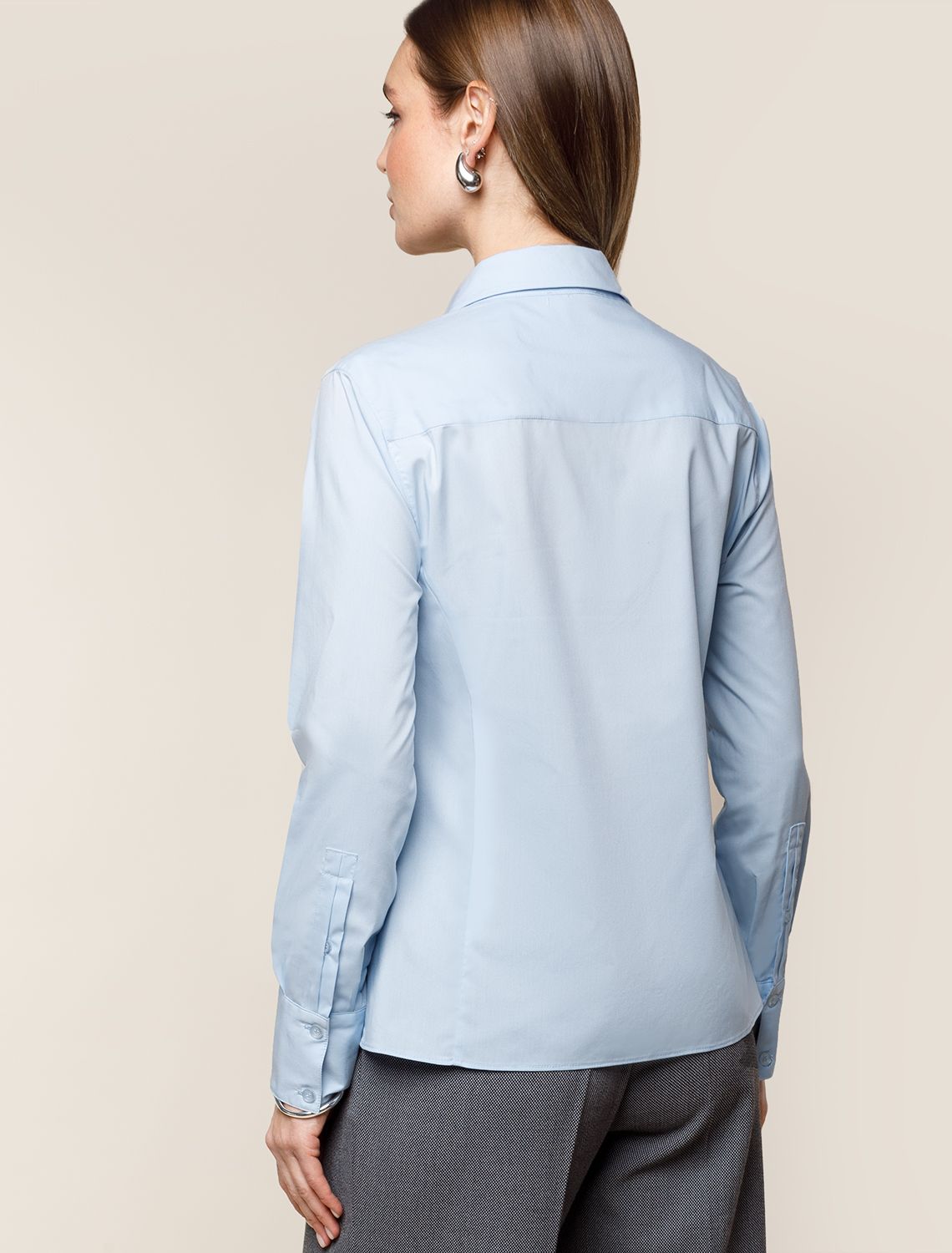 Блузка приталенного силуэта выполнена из эластичного хлопка. Безупречно сидит по фигуре не сковывая движений. Материал обладает высокой формоустойчивостью и воздухопроницаемостью, поддержвая оптимальный микроклимат в течении всего дня. Классический образ можно собрать в паре с черными прямыми брюками или юбкой с разрезами, повседневный расслабленный с джинсами или брюками с пу-покрытием.