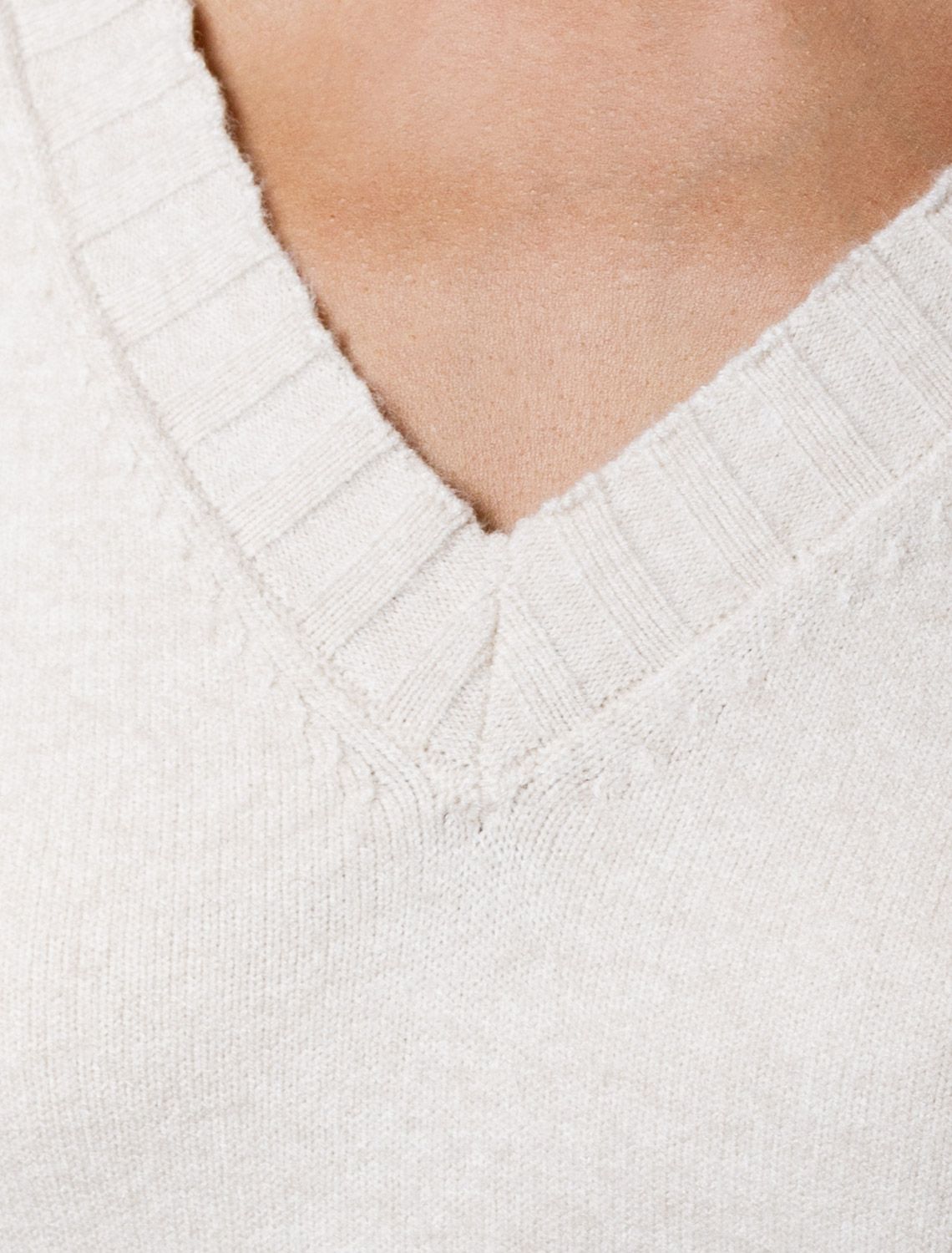 Невероятно женственный джемпер овсяного цвета с V вырезом связан из высококачественной пряжи с кашемиром — идеальное сочетание мягкости и практичности. Пряжа с кашемиром придаёт ему бархатистую нежность и тонкую структуру, каждое прикосновение с которой, напоминает о тепле и уюте в прохладные дни. Благодаря нежной текстуре материала этот вариант отлично подходит даже для чувствительной кожи, не вызывая раздражения и дискомфорта в течение дня. Сдержанный, элегантный силуэт джемпера подчёркивает вкуc обладательницы, а филигранная отделка ворота — внимание к деталям. Универсальный оттенок и изящная мягкость делают его идеальным выбором в любой ситуации. Широкие манжеты и нижний край добавляют аккуратности, а продуманная посадка делает повседневный джемпер удобным для многослойных образов — от офисного комплекта, например, в сочетании с блузкой, до расслабленного уикенда. Свободный крой джемпера идеально подходит для женщин, которые ценят удобство и стиль одновременно, а так же идеально подходит на большие размеры. Благодаря качественной пряже свитер сохраняет форму и внешний вид даже после многократных носок. Практичный фасон идеально подходит для работы в офисе или встреч с друзьями. Благодаря классическому крою джемпер гармонично сочетается практически с любыми элементами гардероба, помогая всегда выглядеть актуально. Сочетается в костюме с брюками D38.013, D38.012 и юбкой D36.016