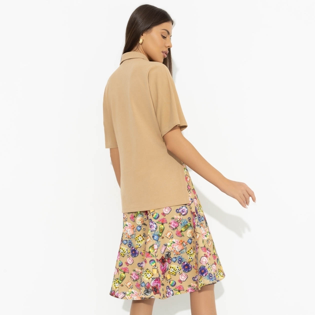 Недавно в столичном музее прошла первая в истории выставка, посвященная моде. Там были представлены культовые вещи, завоевавшие сердца модниц и звание произведения искусства. На экспозиции мог бы быть и костюм CHARUTTI, но увы, у нас не осталось экземпляров для выставки, все предназначены для вас. Комплект состоит из укороченного жакета ассиметричного кроя и расклешенной юбки. Пояс юбки на резинке. Жакет с лацканами. Есть разрезы по бокам изделия. Пуговицы жакета гармонируют с принтом юбки.