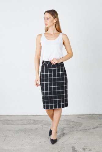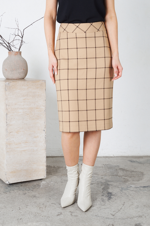 Юбка прилегающего силуэта из костюмной ткани. Сзади по среднему шву застёжка-молния, снизу разрез. Пояс притачной. Изделие на подкладке.