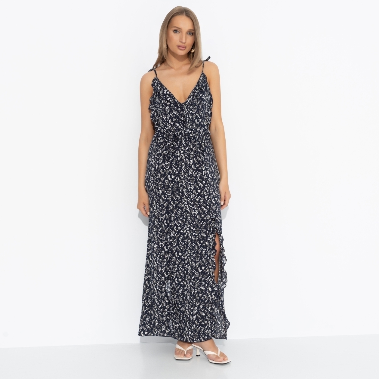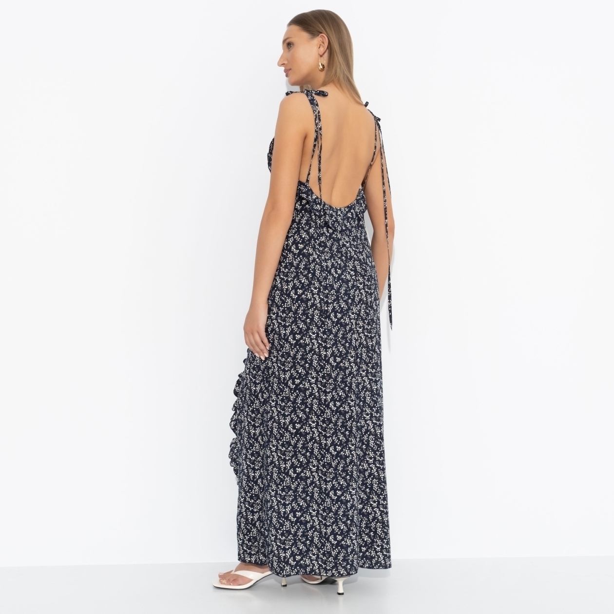 Рецепт идеального образа – это сарафан CHARUTTI в стиле бохо, приправленный щедрой щепоткой роскоши. Микс женственности, свободы и цветочного изящества создает чарующий, почти гипнотический эффект. Сарафан в длине макси на тонких бретелях. Бретели на тонких завязках. Изделие дополнено объемными рюшами. Есть глубокий разрез. Приталенный силуэт. Открытая спинка.