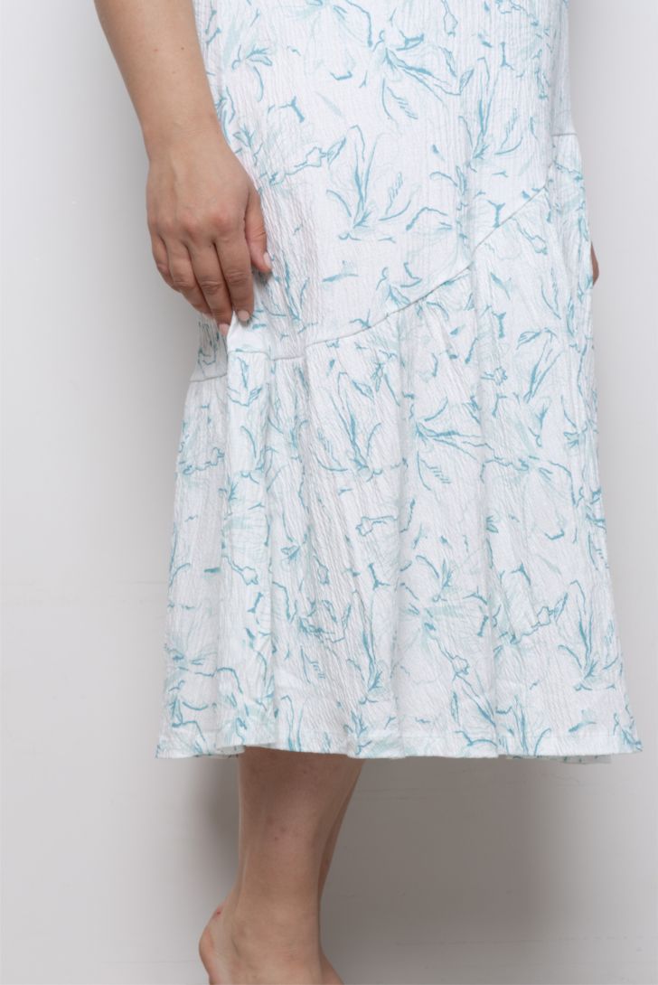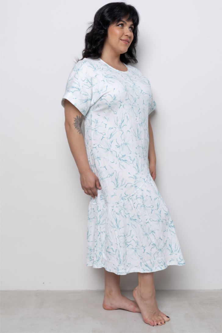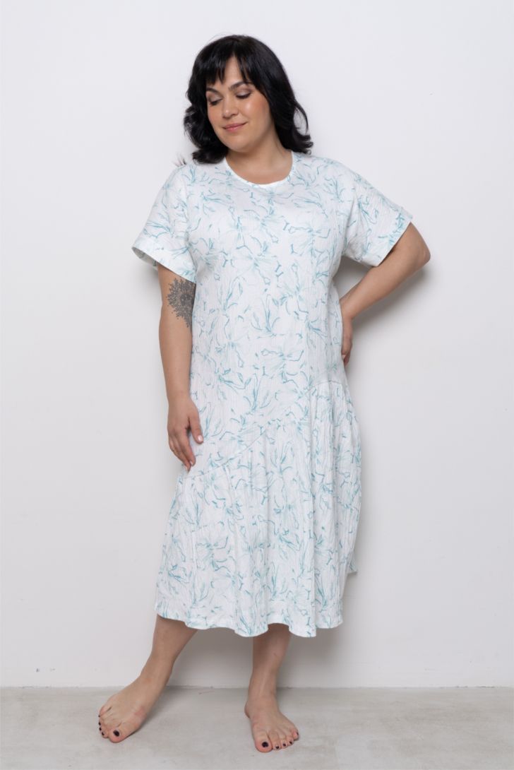 Романтичное платье свободного кроя со спущенным рукавом. Вырез горловины круглый, обработан бейкой из основного полотна. Платье украшает фигурный подрез со сборкой.