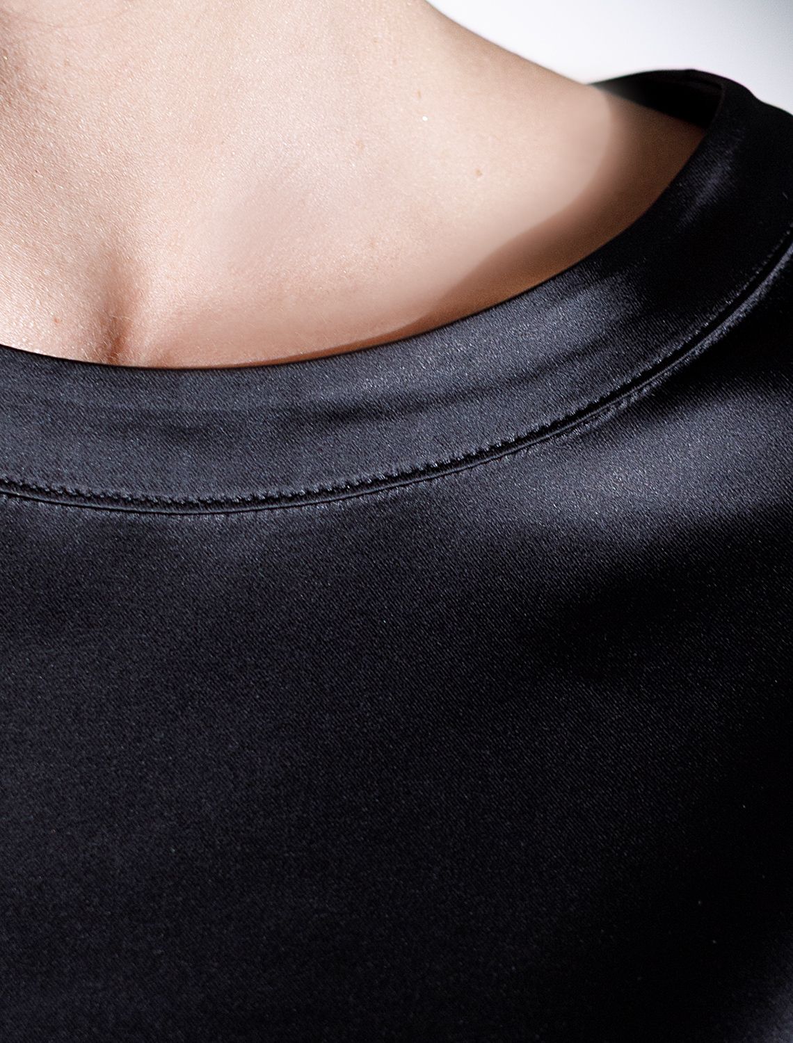Блузка с короткими рукавами черного цвета из струящегося плотного сатина создана для ценительниц комфорта и элегантности. Материал отличается высокой плотностью, что делает блузку устойчивой к износу и сохраняет аккуратный внешний вид даже при длительном использовании. Струящаяся ткань элегантно ложится по фигуре, подчеркивая достоинства силуэта без лишней утяжеленности, в тоже время приятно ощущается на теле.