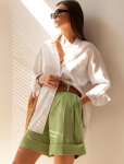 Шорты выполнены из плотного лиоцела. Добавление синтетических волокон в составе изделия предотвращает сминаемость. Эластичный пояс на резинке фиксирует изделие не сковывая движений. Есть дополнительные шлевки для ремня. Свободная модель дополнена боковыми карманами и металлическим логотипом бренда. Для создания завершенного образа сочетайте в костюме с топом D23.058, блузкой D28.054, D29.238, D29.239 и D29.240