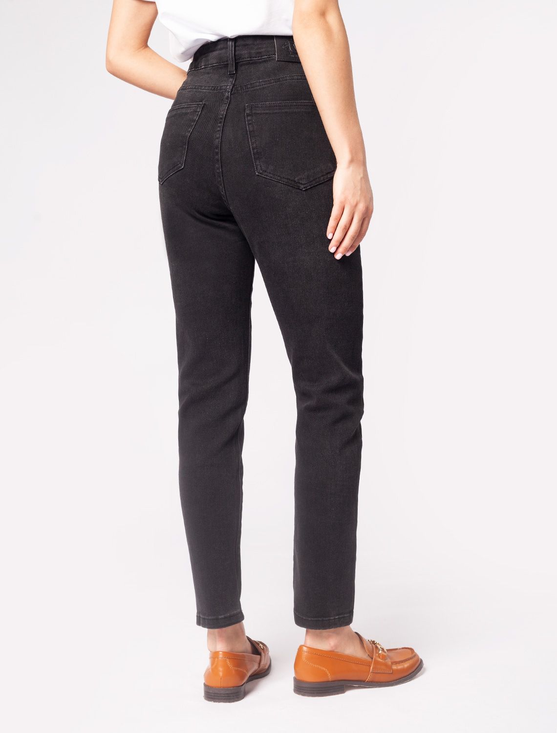 Черные слегка укороченные супер-эластичные джинсы skinny. В состав добавлены стрейчевые волокна, поэтому материал тянется, а модель комфортно садится по фигуре и не сковывает движения. Хорошо будут в сочетании с футболкой, блузкой или свитшотом и с обувью на низком каблуке.