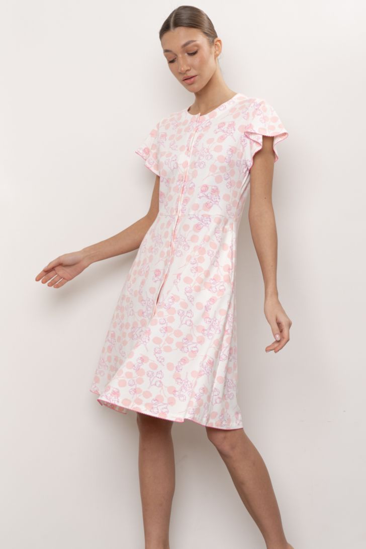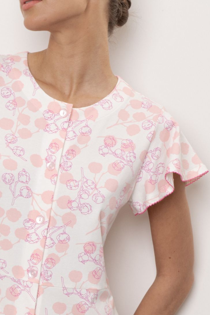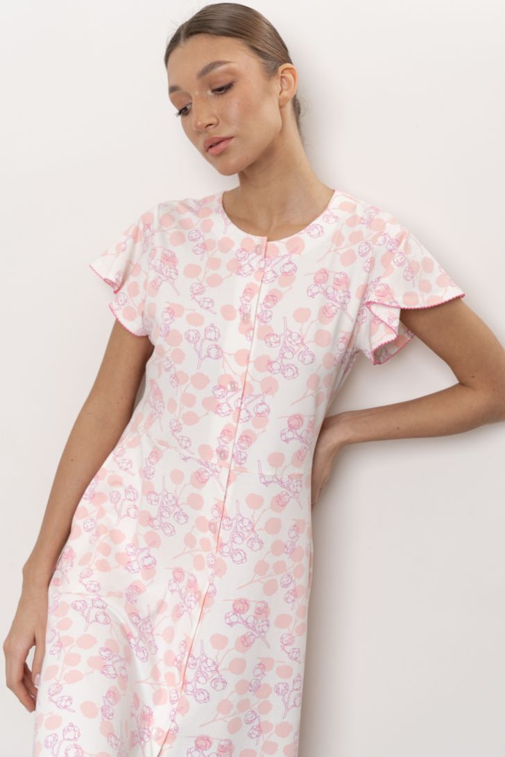 Халат на пуговицах приталенного силуэта с отрезной линией талии. Рукава-крылышки задают романтичное и игривое настроение. Вырез горловины круглый. В боковых швах функциональные карманы. Модель декорирована контрастной отделочной строчкой.