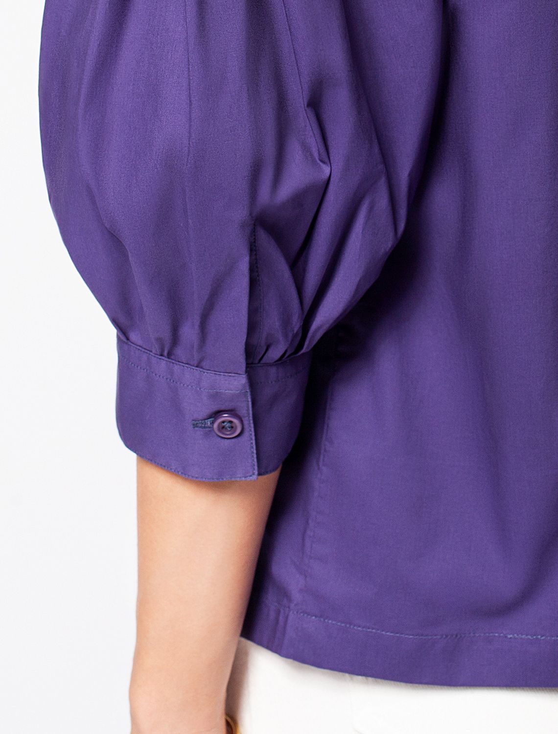 Блузка выполнена из премиального поплина из 100% хлопка фиолетового цвета. Укороченная модель с рукавами-фонариками одинаково хорошо будет смотрятся на выпуск или в заправку. Оптимальная длина изделия позволяет составить образы в расслабленном стиле.